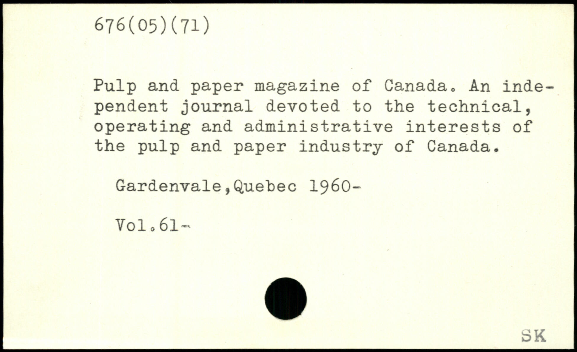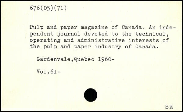 Pulp and paper magazine of Canada, An independent journal devoted to the technical, operating and administrative interests of the pulp and paper industry of Canada. Gardenvale,Quebec 1960-