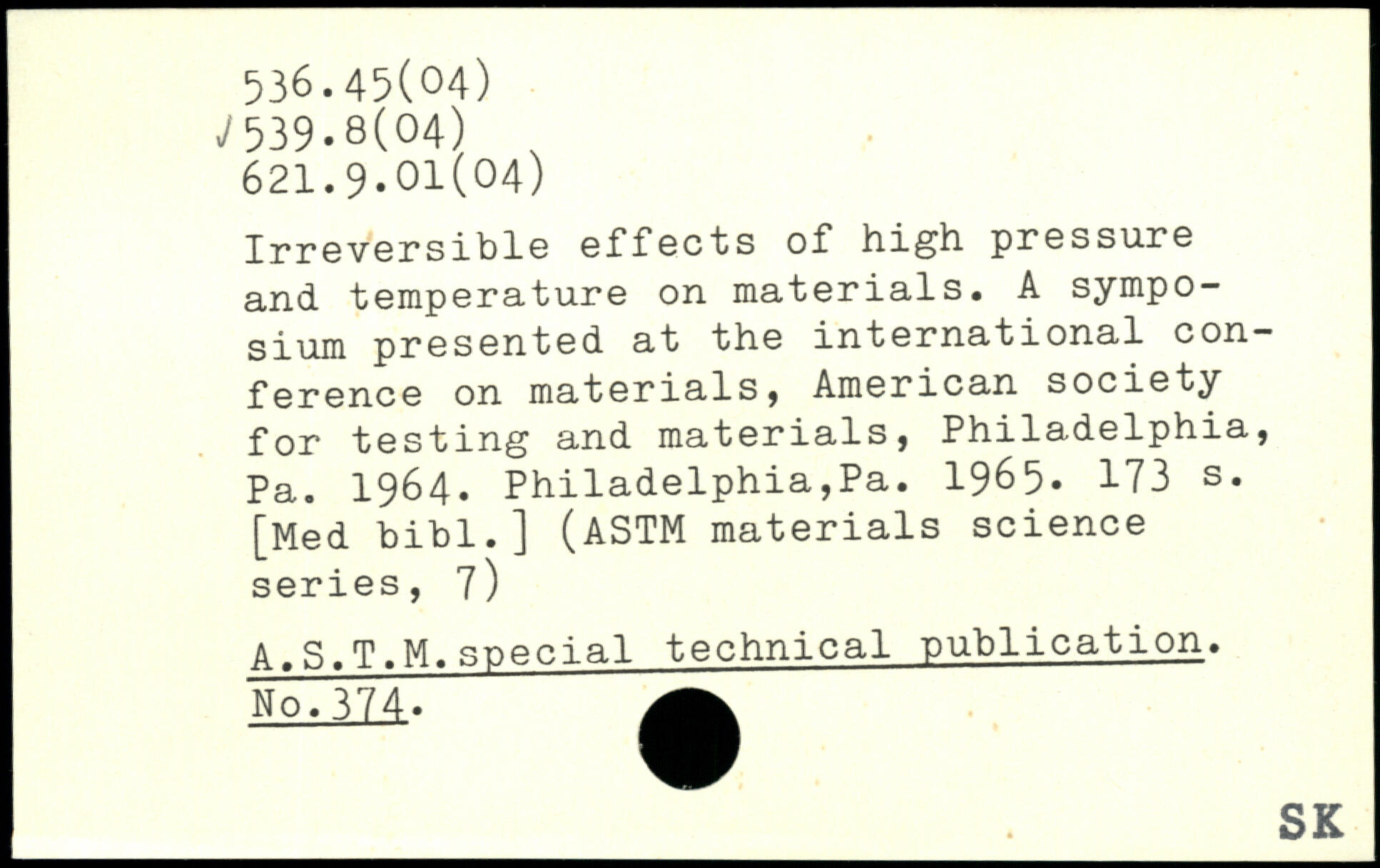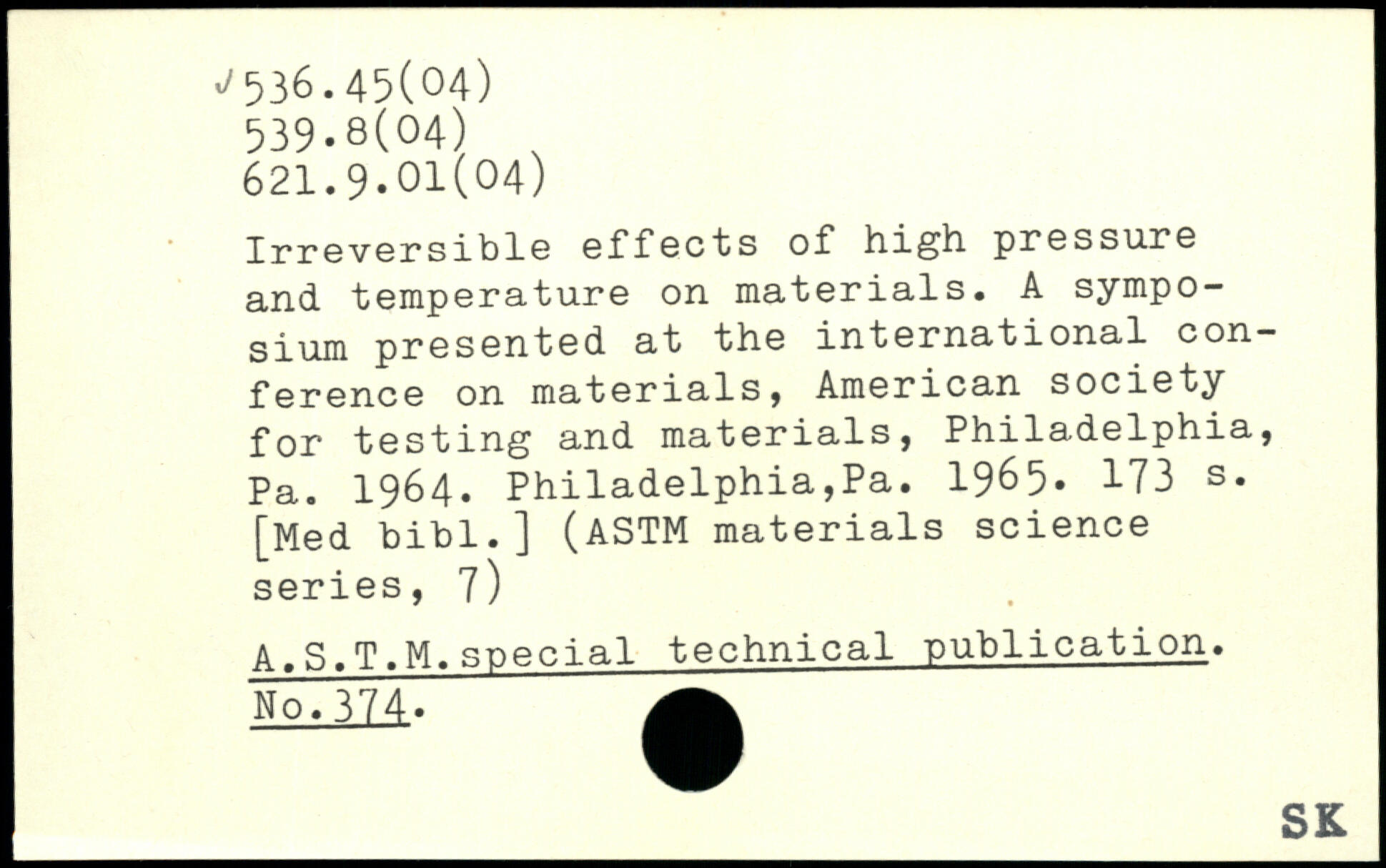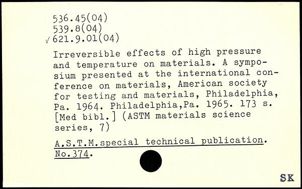 Irreversible effects of high pressure and temperature on materials. A symposium presented at the international conference on materials, American society for testing and materials, Philadelphia, Pa. 1964. Philadelphia,Pa. 1965.