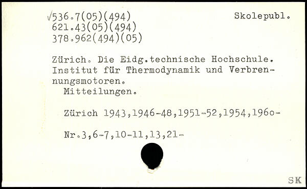 Zürich. Die Eidg.technische Hochschule. Institut für Thermodynamik und Verbrennungsmotoren. Mitteilungen. Zürich 194391946~48?1951“52?1954,196o~ Nr o