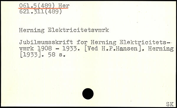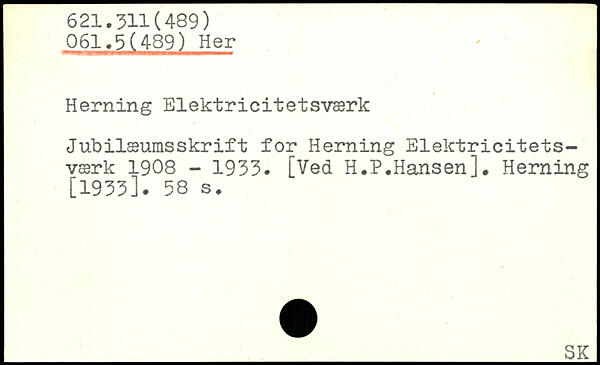 Herning Elektricitetsværk Jubilæumsskrift for Herning Elektricitetsværk 1908 - 1933. [Ved H.P.Hansen]. Herning [1933].