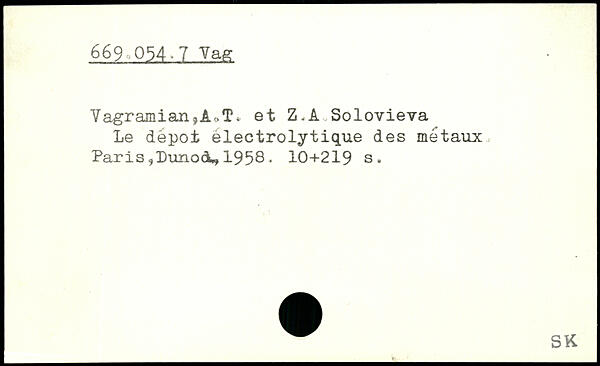 YagramiarijAoT. et Z.A Solovieva Le depot électrolytique des métaux Paris,Luno<i, 1958.
