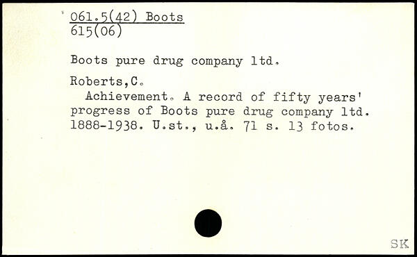 Boots pure drug company ltd. Roberts,C, Achievemento A record of fifty years’ progress of Boots pure drug company ltd, 1888-1938. U.st,, u.a.