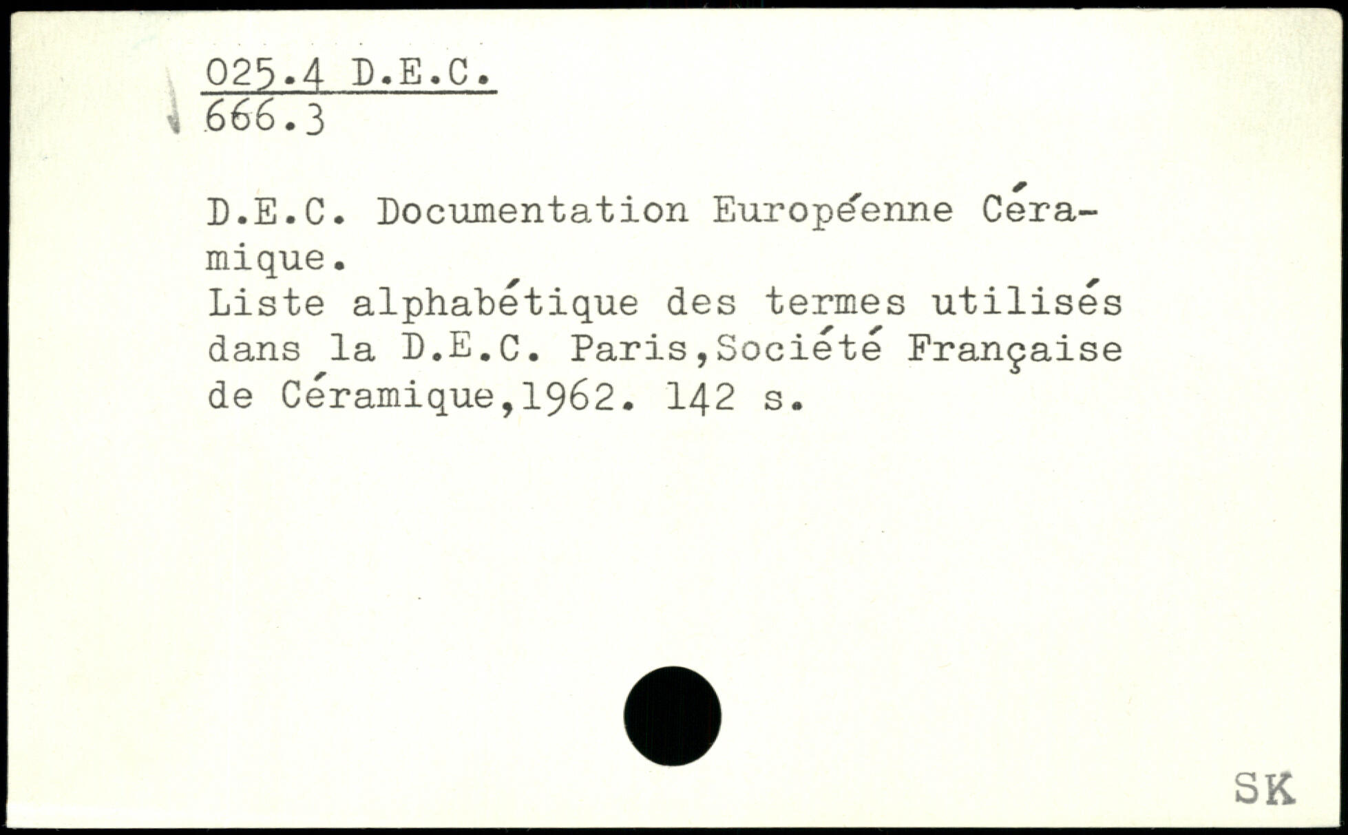 D.E.C. Documentation Européenne Céramique. Liste alphabétique des termes utilisés dans la D.E.C. Paris,Société Française de Céramique,1962.
