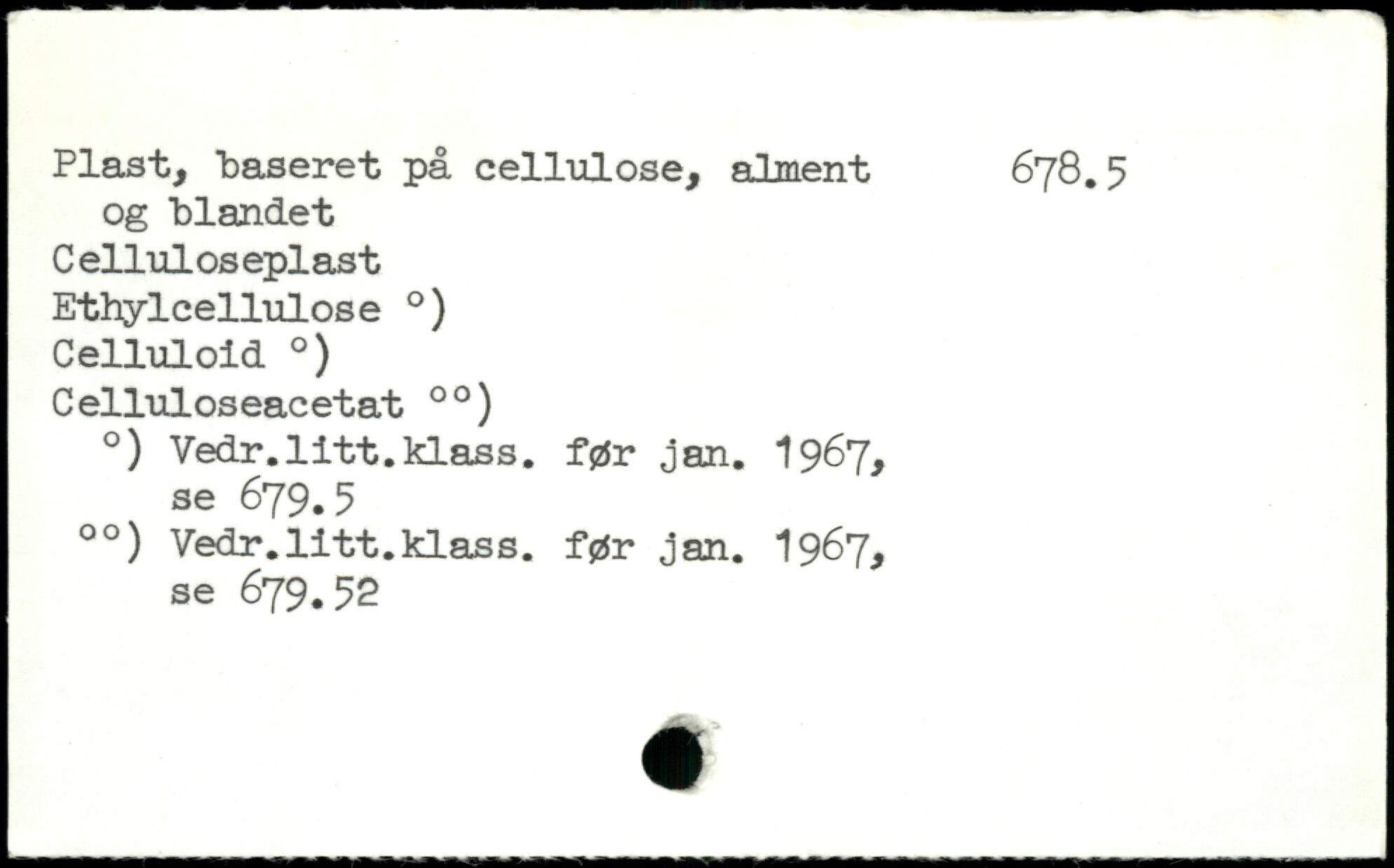 Plasty "baseret på cellulose, alment 678.5 og "blandet C ellul os epl as t Ethylcellulose .) Celluloid .) Celluloseacetat ..) .) Vedr.litt.klans, før jan. 1967, se 679.5 00) Vedr.litt.klass. før jan. 1967, se 679.52