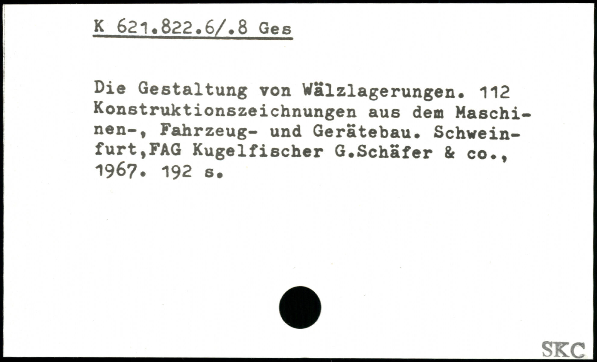 Die Gestaltung von Wälzlagerungen. 112 Konstruktionszeichnungen aus dem Maschinen-, Fahrzeug- und Gerätebau. Schwein-furt,FAG Kugelfischer G.Schäfer & co., 1967. 192 8.