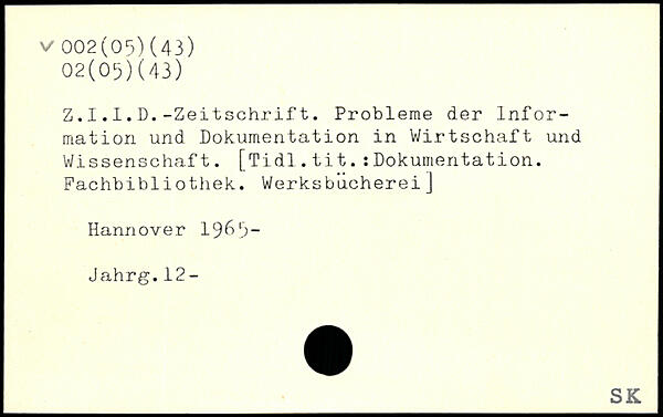 Z.I.I.D.-Zeitschrift. Probleme der Information und Dokumentation in Wirtschaft und Wissenschaft. [Tidl.tit.:Dokumentation. Fachbibliothek. Werksbucherei] Hannover 1^6 lj- Jahrg.12 -
