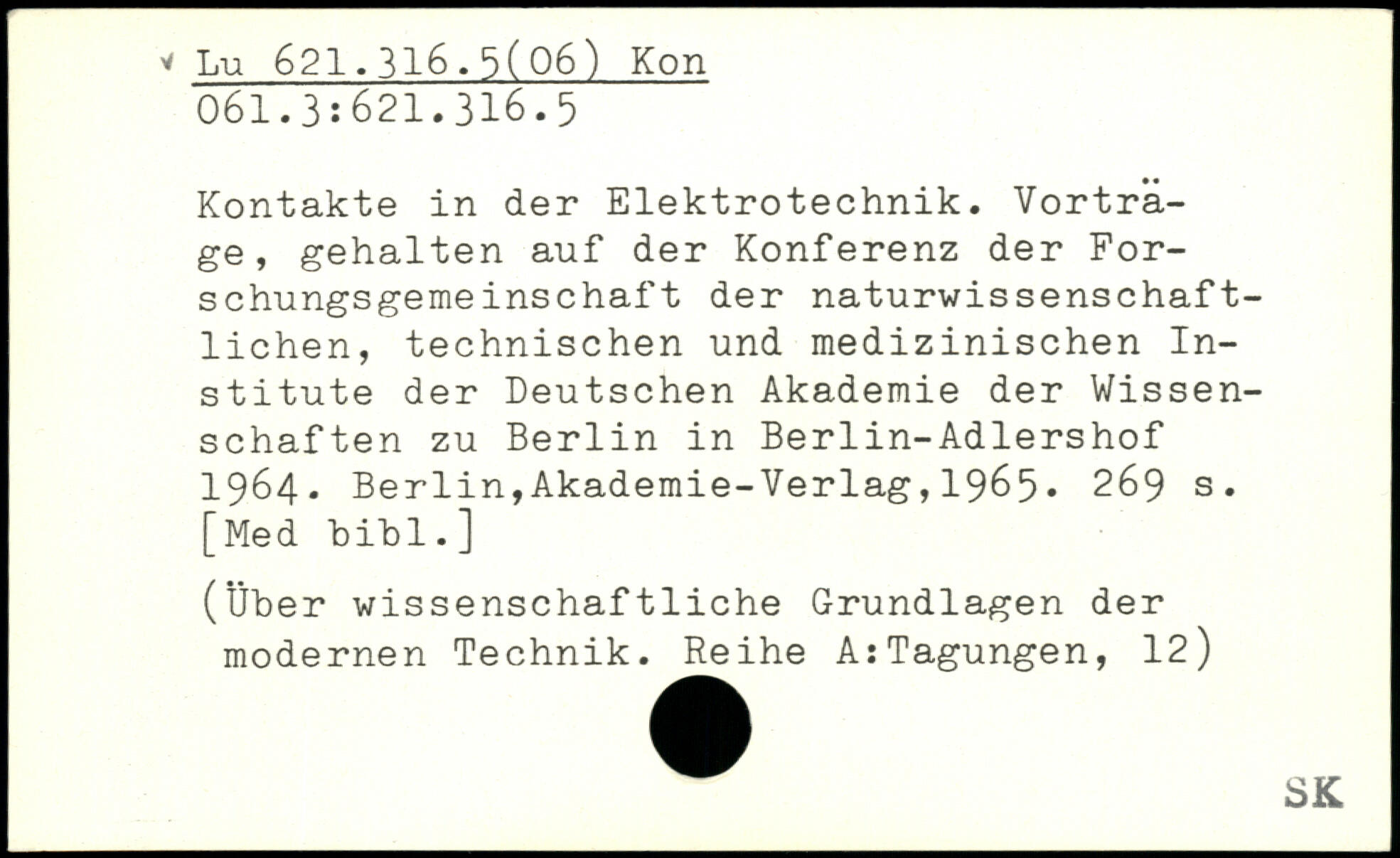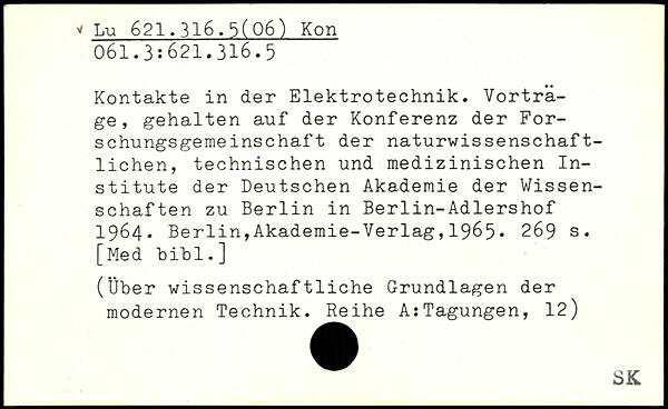Kontakte in der Elektrotechnik. Vorträge, gehalten auf der Konferenz der Forschungsgemeinschaf t der naturwissenschaftlichen, technischen und medizinischen Institute der Deutschen Akademie der Wissenschaften zu Berlin in Berlin-Adlershof 1964.