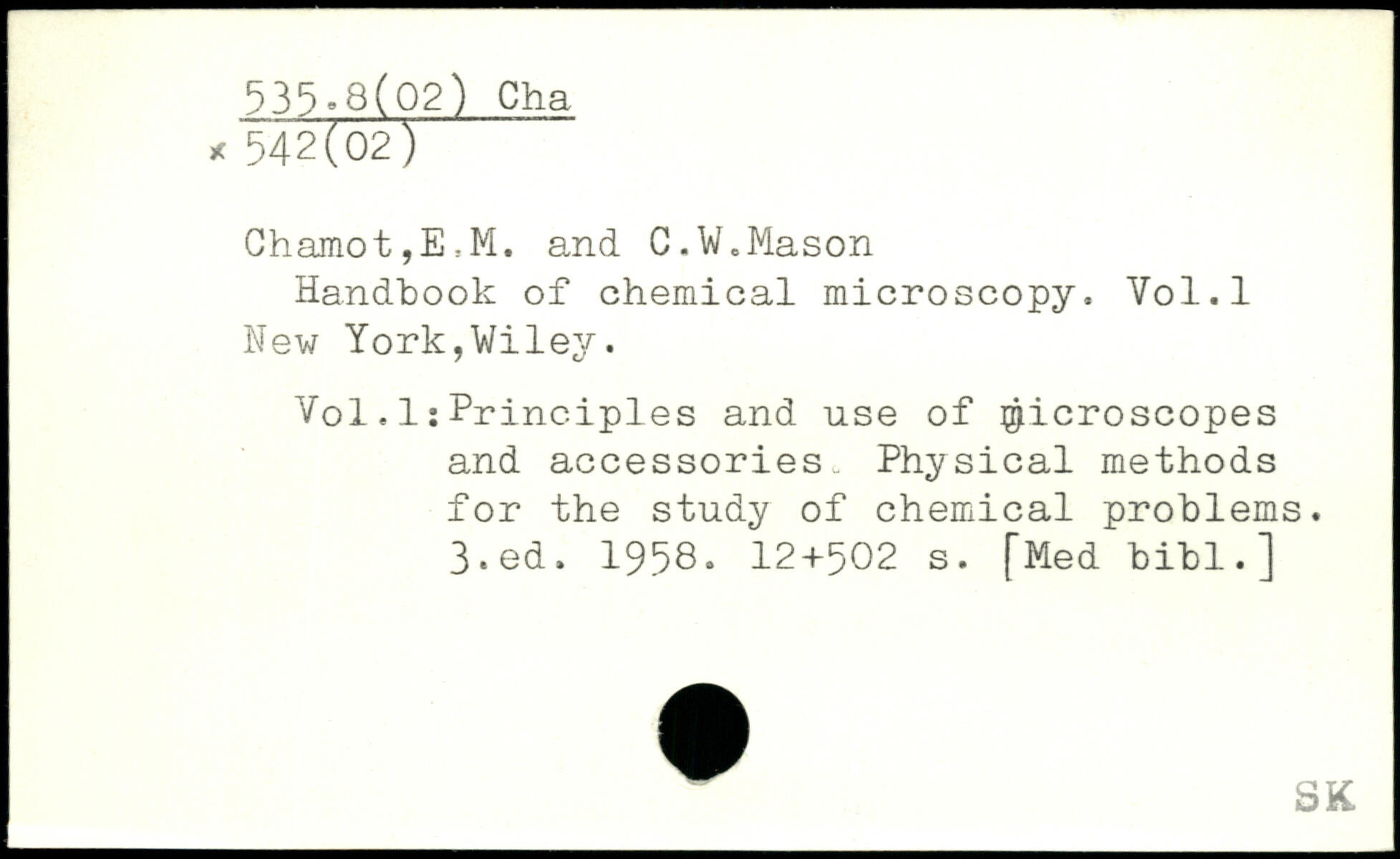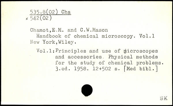 Chamot,E,M. and C.W.Mason Handbook of chemical microscopy. Vol.l New York,Wiley. Vol.Is Principles and use of Microscopes and accessories Physical methods for the study of chemical problems.