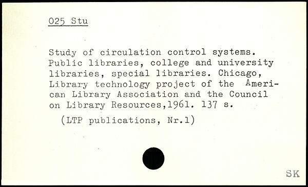 Study of circulation control systems. Public libraries, college and university libraries, special libraries. Chicago, Library technology project of the American Library Association and the Council on Library Resources,1961.