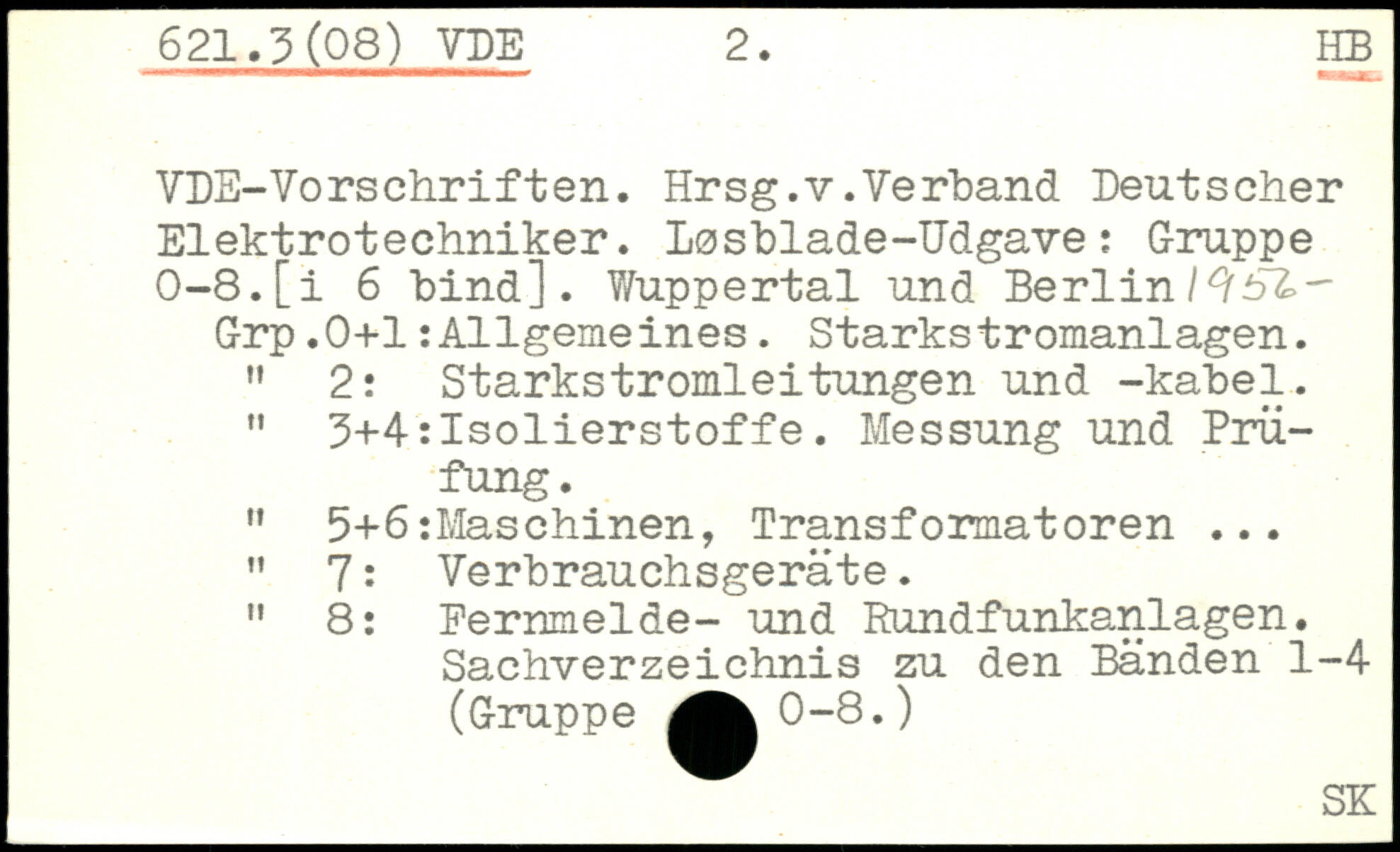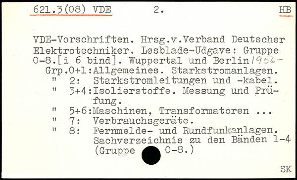 VDE-Vorschriften. Hrsg.v.Verband Deutscher Elektrotechniker. Løsblade-Udgave: Gruppe 0-8. [i 6 hind]. Wuppertal und Berlin l^lSZ-Grp.0+1:Allgemeines. Starkstromanlagen. M 2: Starkstromleitungen und -kabel. " 3+4-: Isolierstoffe. Messung und Prü fung. " 5+6:Maschinen, Transformatoren ... " 7: Verbrauchsgeräte. " 8: Pernmelde- und Rundfunkanlagen. Sachverzeichnis zu den Bänden 1-4-(Gruppe ^^0-8.)