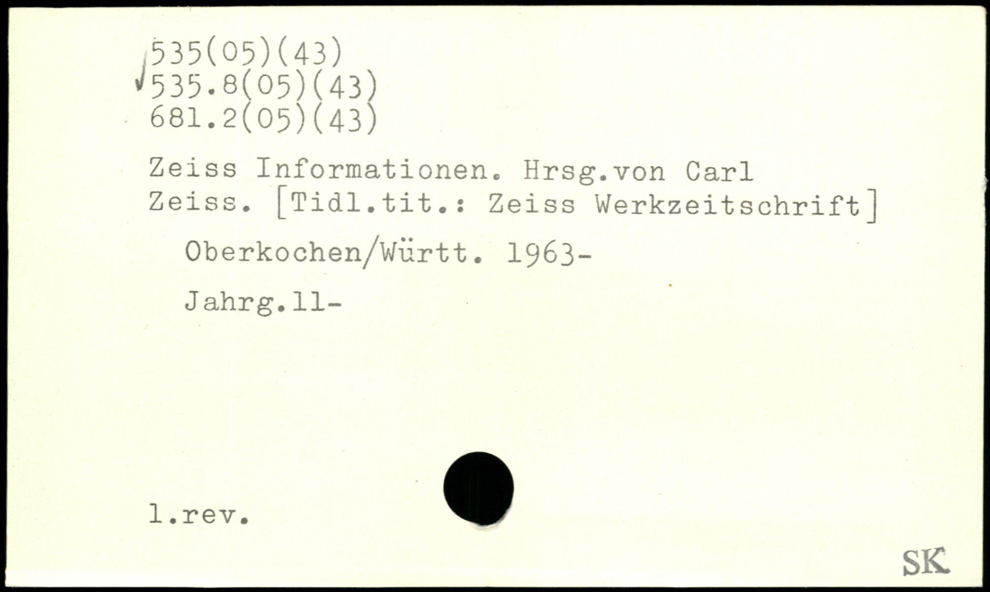 Zeiss Informationen. Hrsg.von Carl Zeiss. [Tidl.tit.: Zeiss Werkzeit Schrift] Oberkochen/württ. 1963- J ahrg.11-