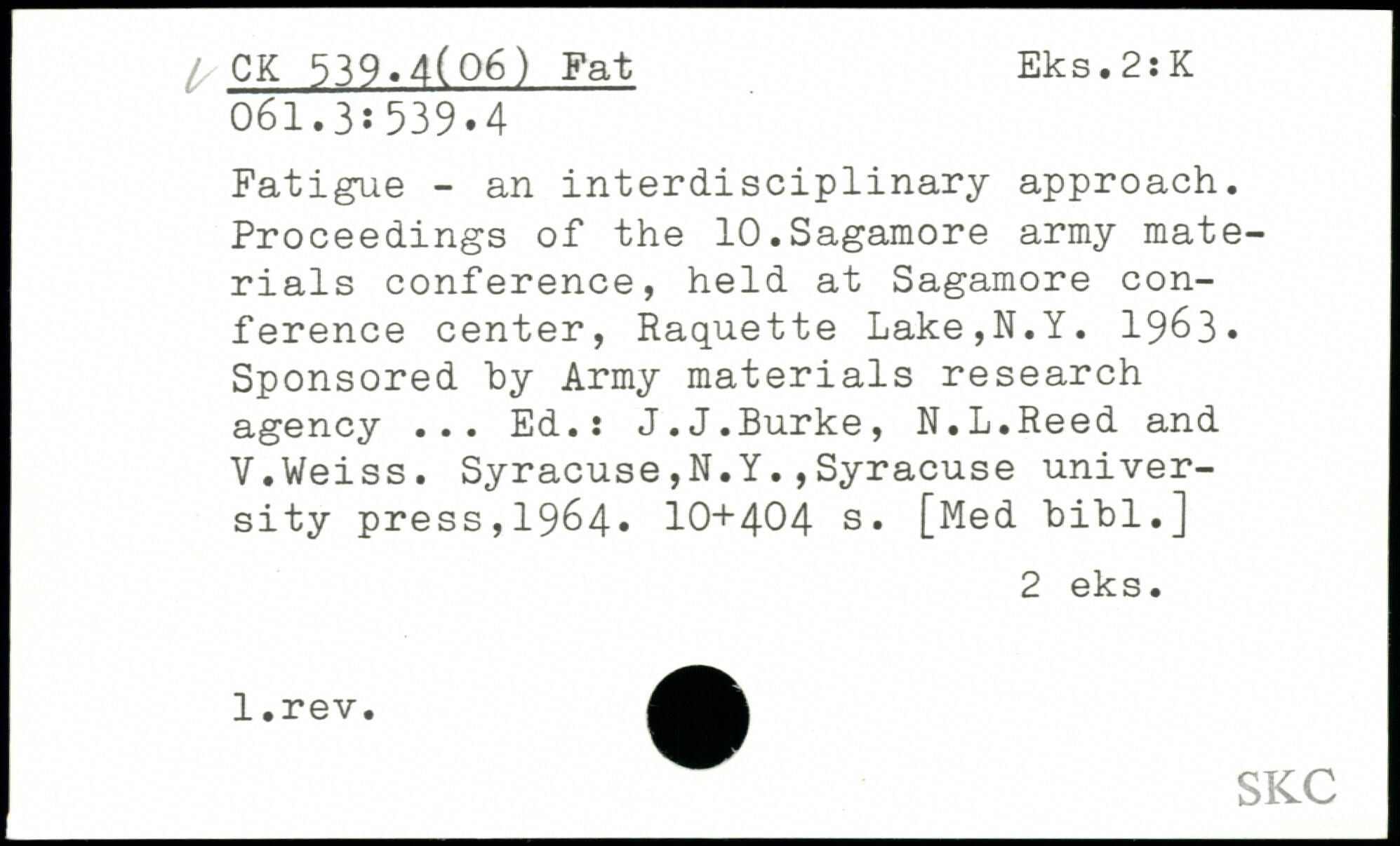 Fatigue - an interdisciplinary approach. Proceedings of the 10.Sagamore army materials conference, held at Sagamore conference center, Raquette Lake,N.Y. 1963, Sponsored by Army materials research agency ... Ed.: J.J.Burke, N.L.Reed and ■ V.Weiss.