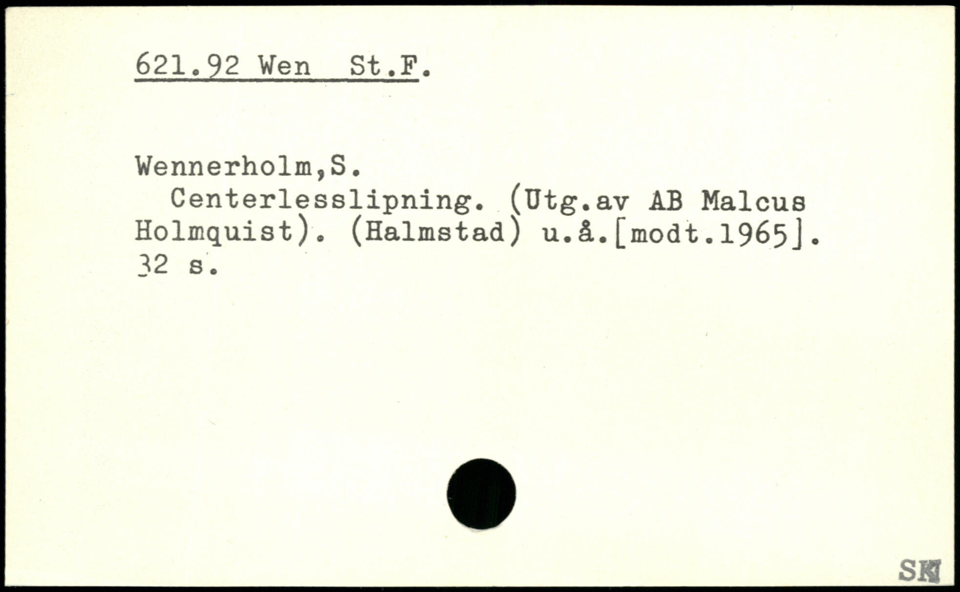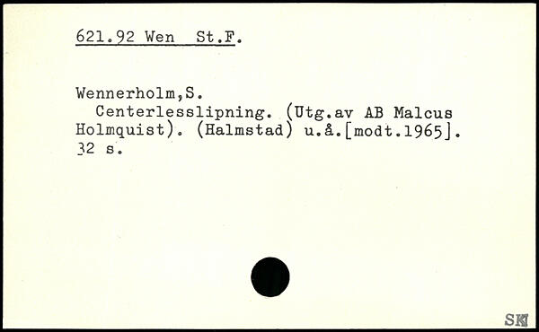 Centerlesslipning. (Utg.av AB Malcus Holmquist). (Halmstad) u.å.[modt.1965].