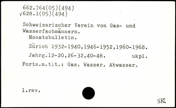 Schweizerischer Verein von Gas- und Wasserfachmannern. Monatsbulletin. Zürich 1932-1940,1946-1952,1960-1968. Jahrg.12-20,26-32,'40-48. ukpl. Forts.m.tit.: Gas. Wasser. Abwasser. l.rev.