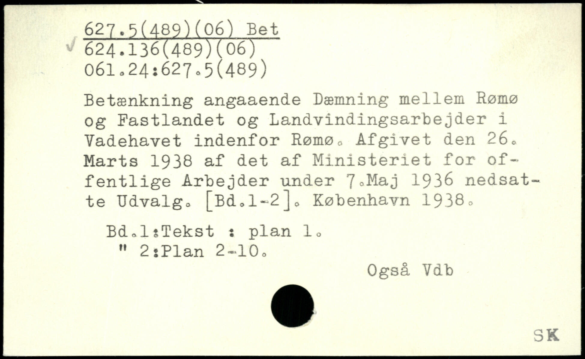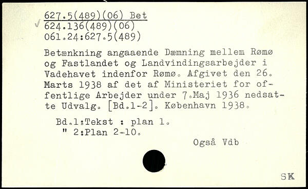 Betænkning angaaende Dæmning mellem Rømø og Fastlandet og Landvindingsarbejder i Vadehavet indenfor Rømø. Afgivet den 26. Marts 1938 af det af Ministeriet for offentlige Arbejder under 7.^ai 1936 nedsatte Udvalg. [Bd.l-2]0