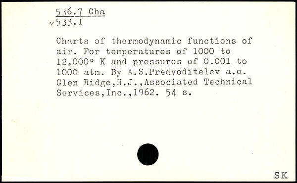 Charts of thermodynamic functions of air. For temperatures of 1000 to 12,000. K and pressures of 0.001 to 1000 atm. By A.S.Predvoditelev a.o. Glen Rid^e