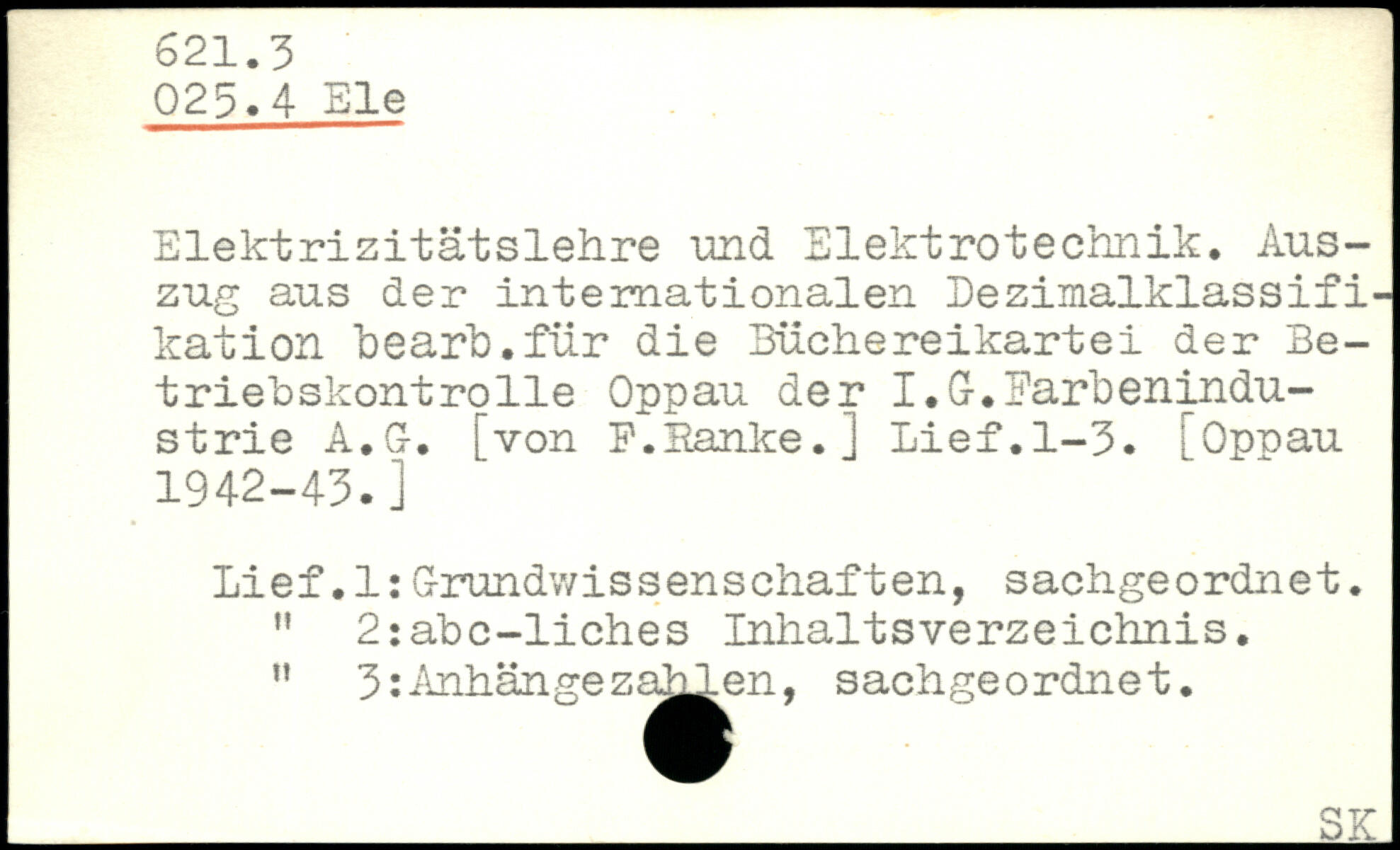 Elektrizitätslehre und Elektrotechnik. Auszug aus der internationalen Lezimalklassifi-kation bearb.für die Büchereikartei der Betriebskontrolle Oppau der 1,0.Barbenindustrie A.G-. [von B.Sänke.] Lief.1-3. [Opnau 1942-43.] Lief.1:Grundwissenschaften, sachgeordnet. H 2:abc-liches Inhaltsverzeichnis. ” 3:AnhängezaJ^en, sachgeordnet.
