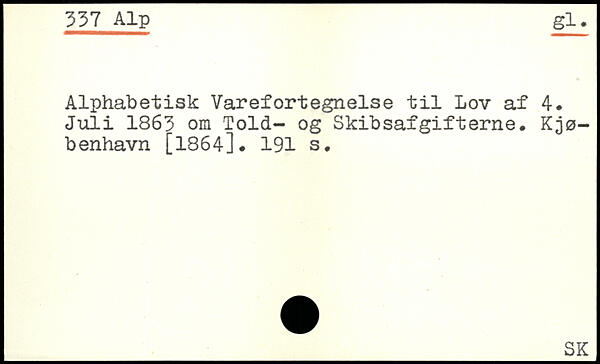 Alphabetisk Varefortegnelse til Lov af 4. Juli 1863 om Told- og Skibsafgifterne. Kjø-benhavn [1864]