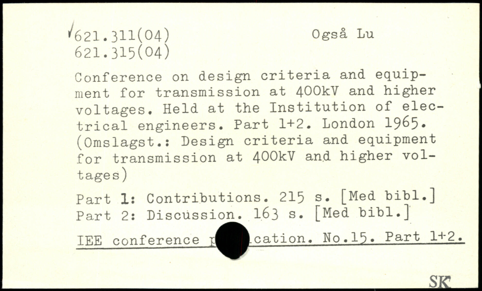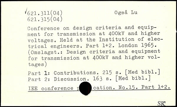 Conference on design criteria and equipment for transmission at 4-OOkV and higher voltages. Held at the Institution of electrical engineers. Part 1+2. London 19^5. (Omslagst.: Design criteria and equipment for transmission at 400kV and higher voltages) Part Is Contributions.