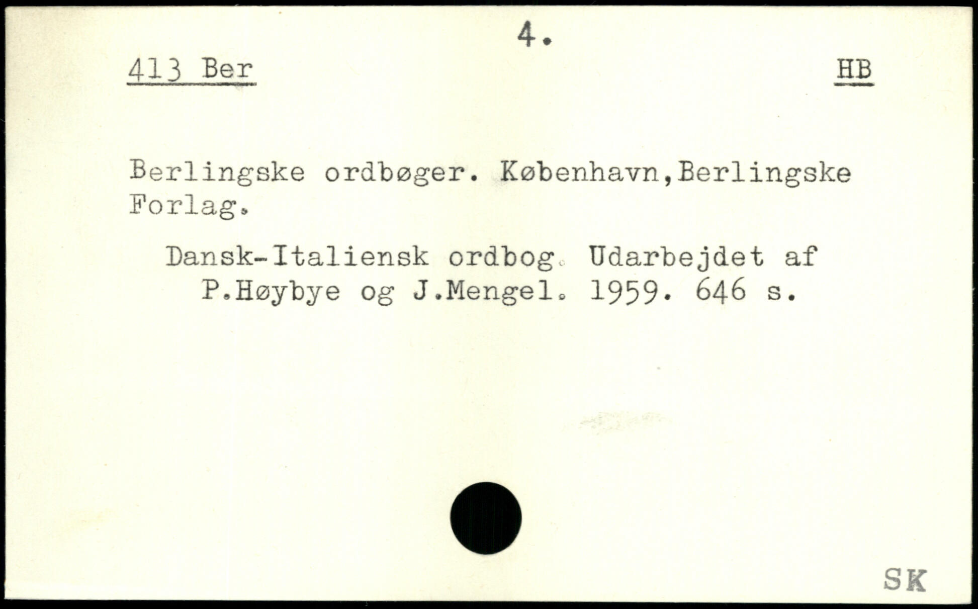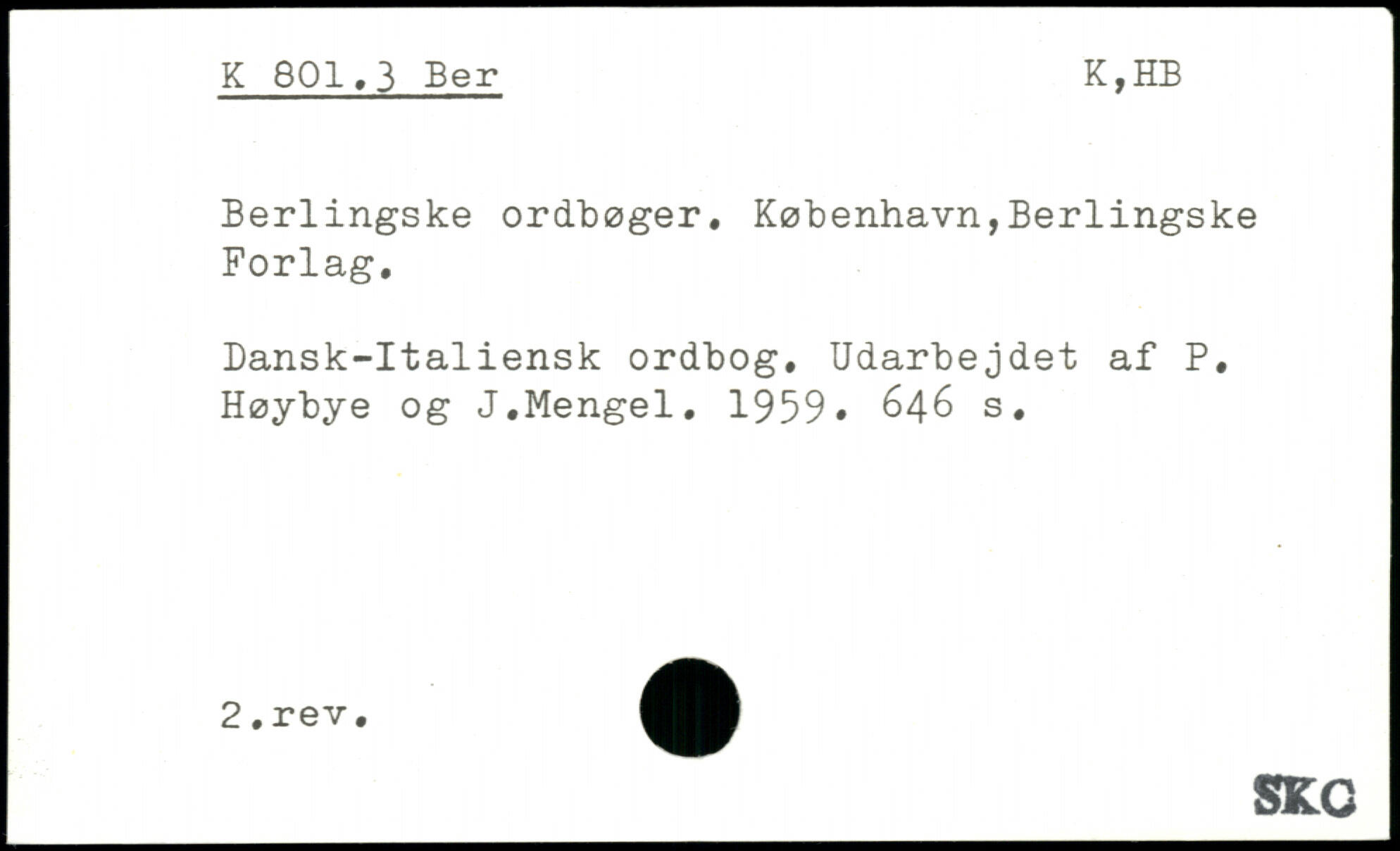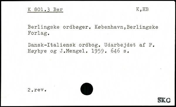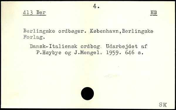 Berlingske ordbøger, København,Berlingske Forlag, Dansk-Italiensk ordbog. Udarbejdet af P, Høybye og J,Mengel. 1959