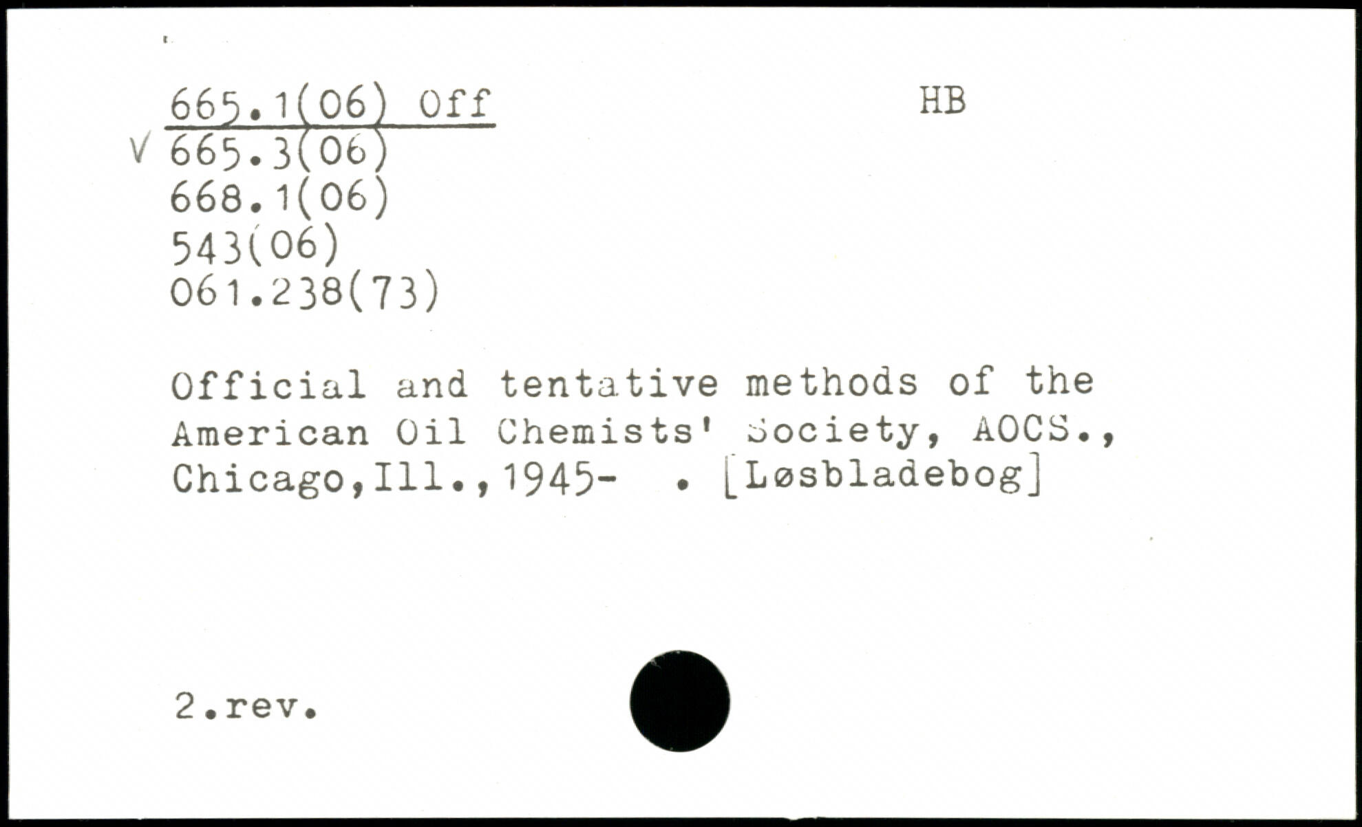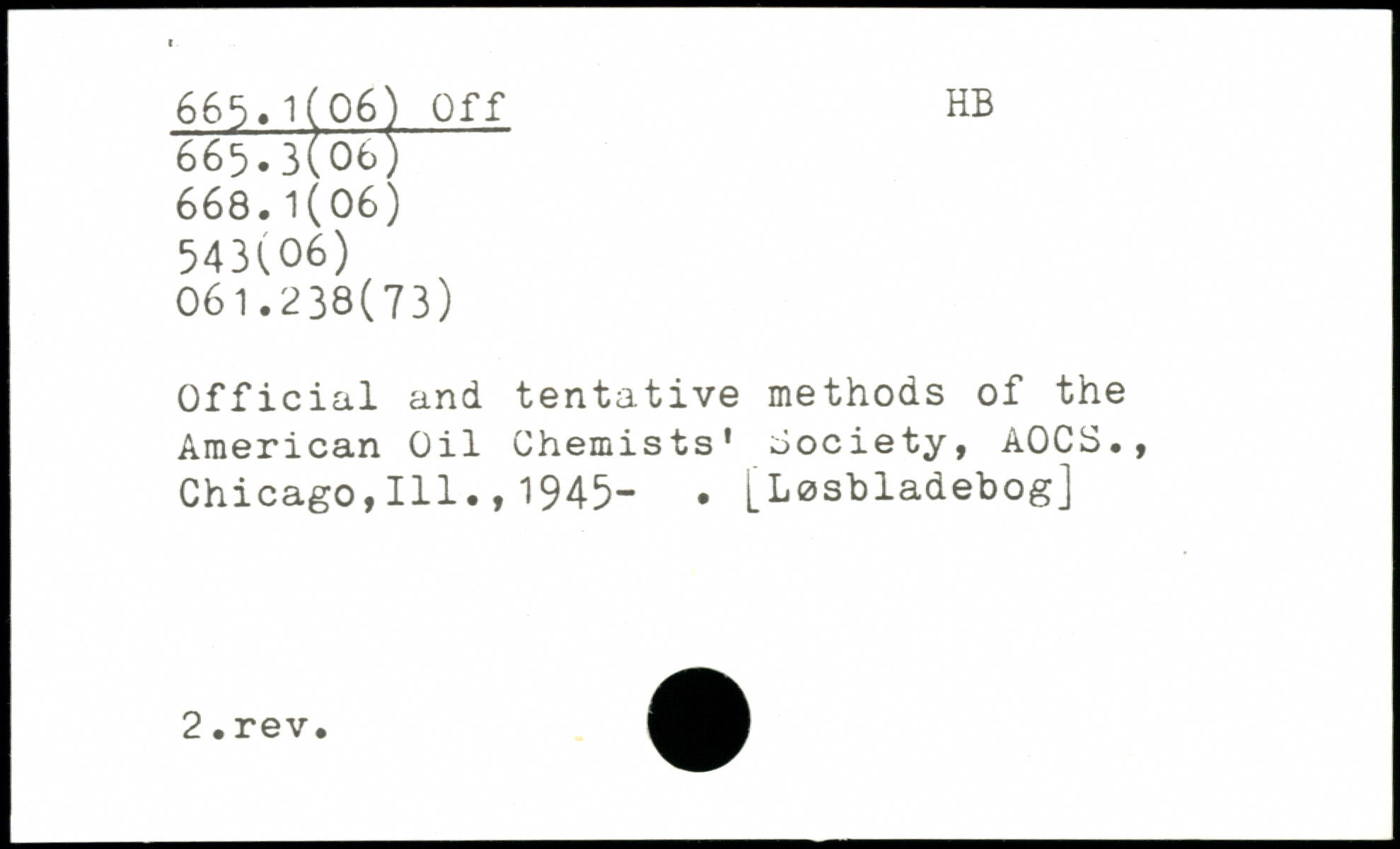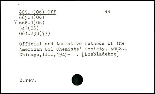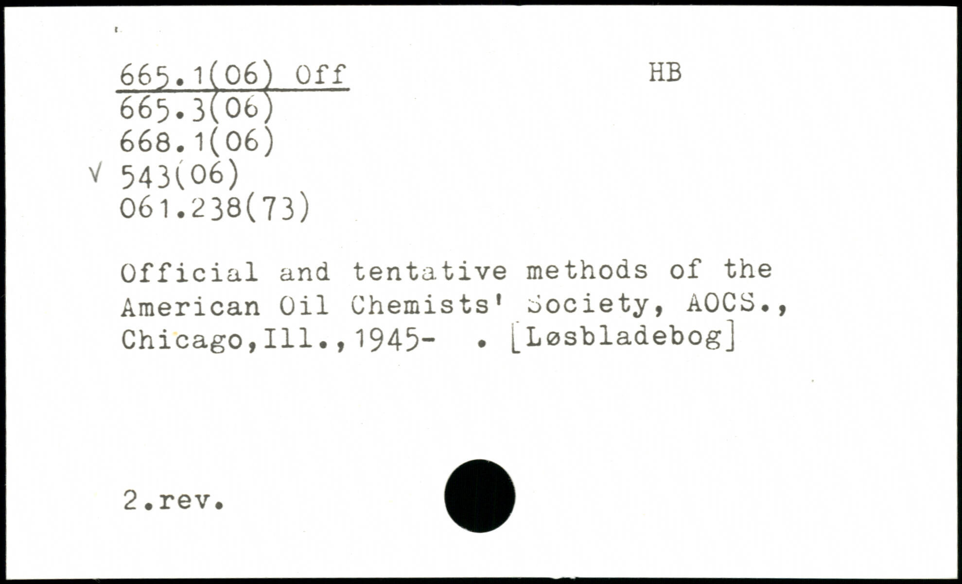 Official and tentative methods of the American Oil Chemists' society, AOCS., Chicago,111.,1945-. [Losbladebog]