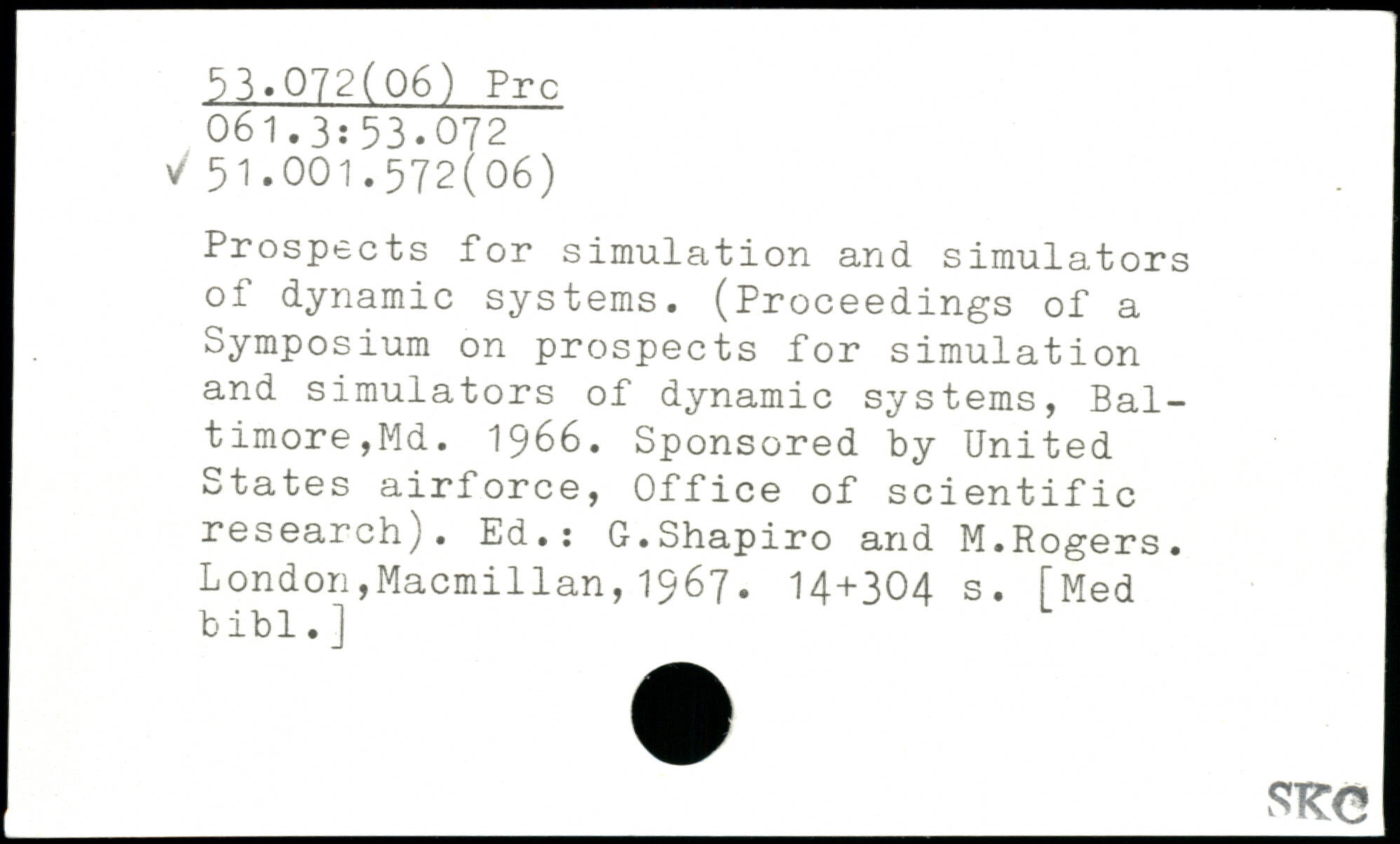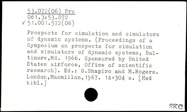 Prospects for simulation and simulators of dynamic systems. (Proceedings of a Symposium on prospects for simulation and simulators of dynamic systems, Baltimore, Md. 1966. Sponsored by United States airforce, Office of scientific research). Ed.: G.Shapiro and M.Rogers.