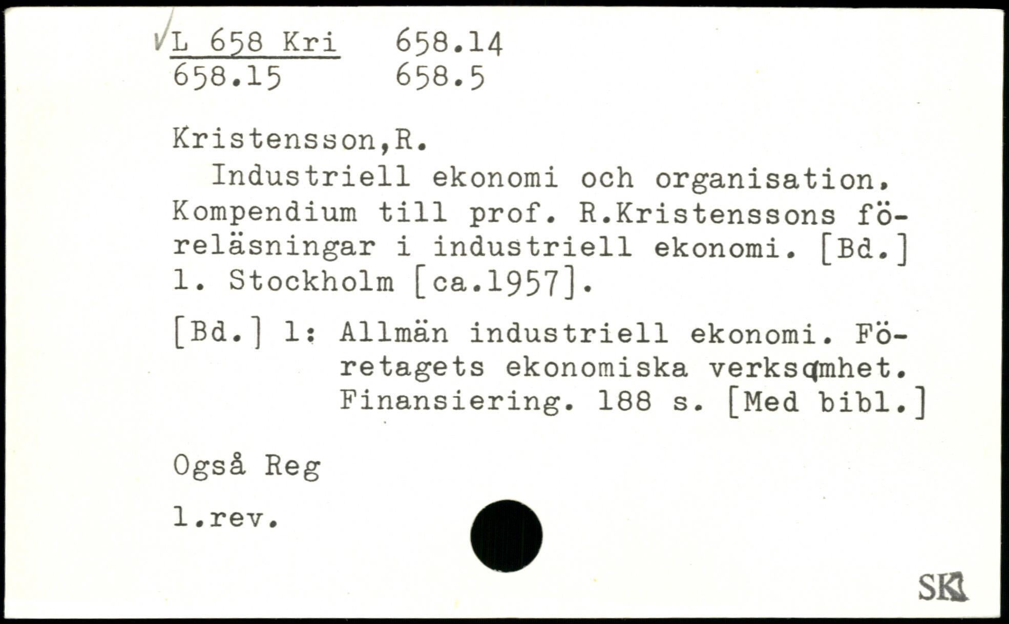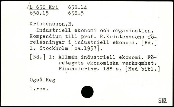 Industriell ekonomi och organisation. Kompendium till prof. R.Kristenssons föreläsningar i industriell ekonomi. [Bd.] 1. Stockholm [ca.1957]. [Bd.] 1ï Allmän industriell ekonomi. Företagets ekonomiska verkscfmhet. Finansiering.