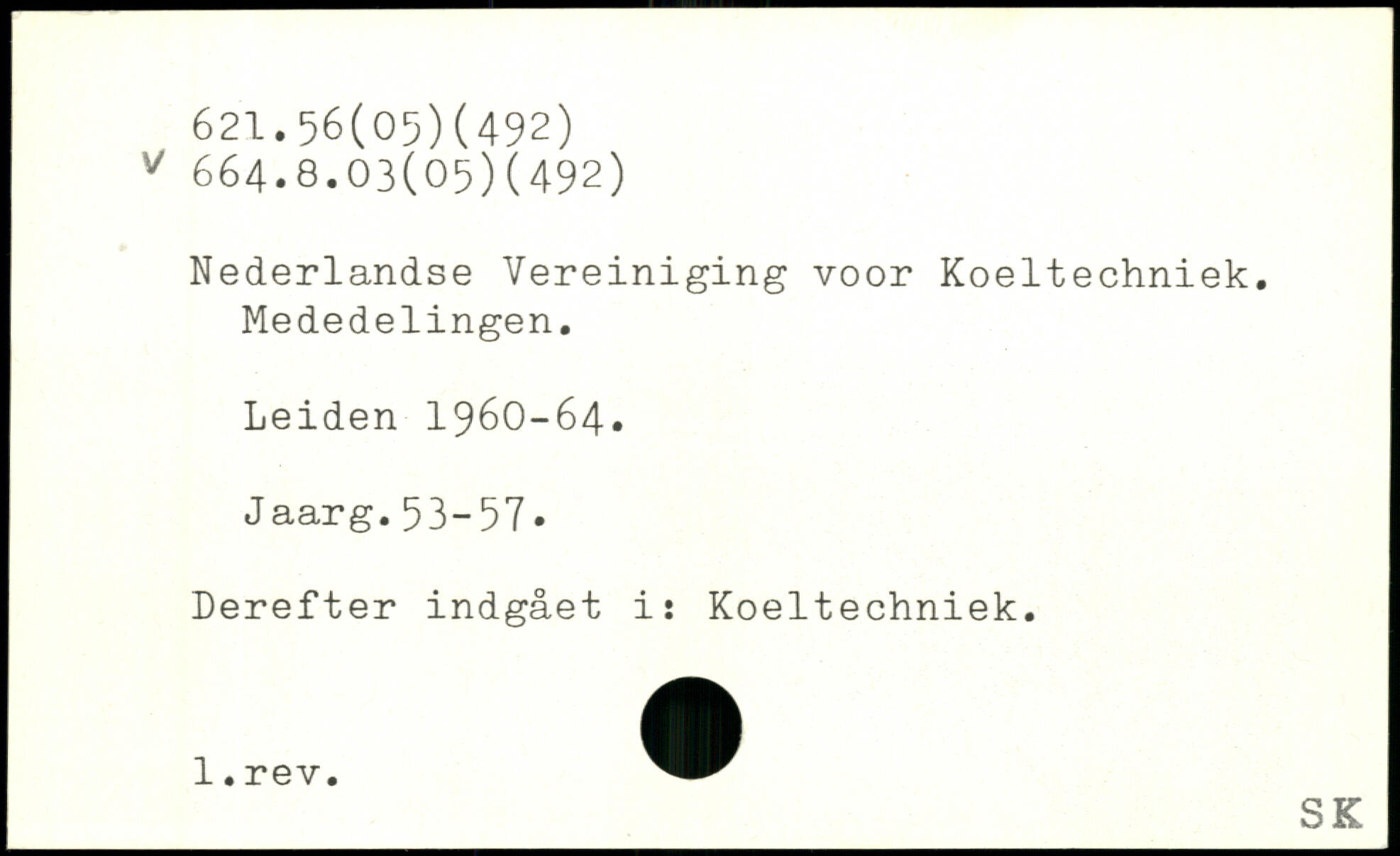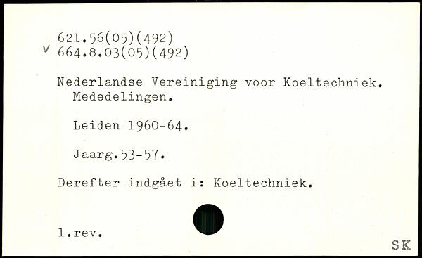 Nederlandse Vereiniging voor Koeltechniek. Mededelingen. Leiden 1960-64. Jaarg.53-57- Derefter indgået i: Koeltechniek. _SKJ