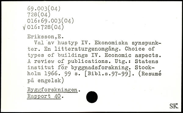 Yal av hustyp IV. Ekonomiska synspunkter. En litteraturgenomgång. Choice of types of buildings IY. Economic aspects. A review of publications. Utg.: Statens institut för byggnadsforskning.