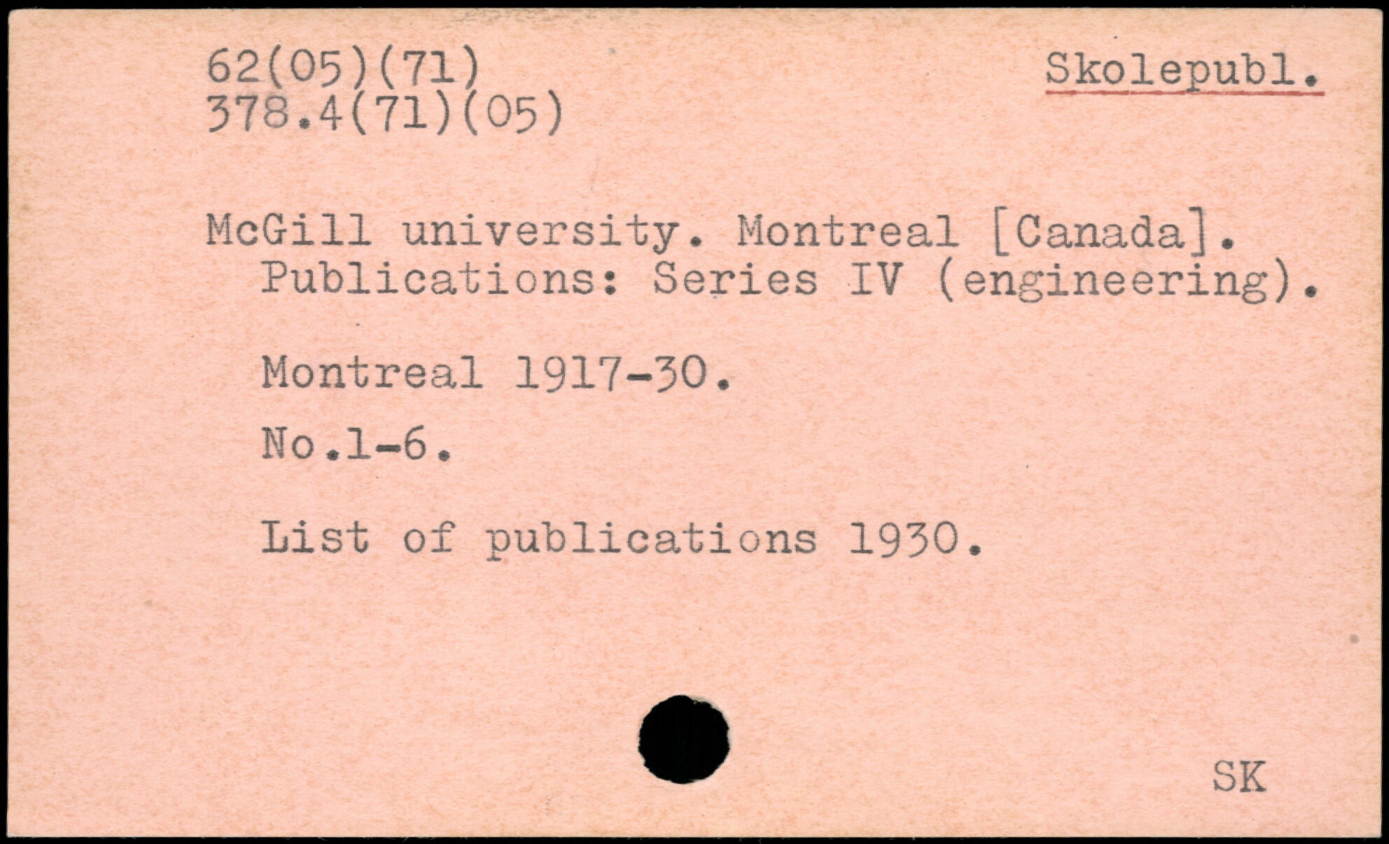 McGill university. Montreal [Canada]. Publications: Series IV (engineering). Montreal 1917-30. No.1-6. List of publications 1930.