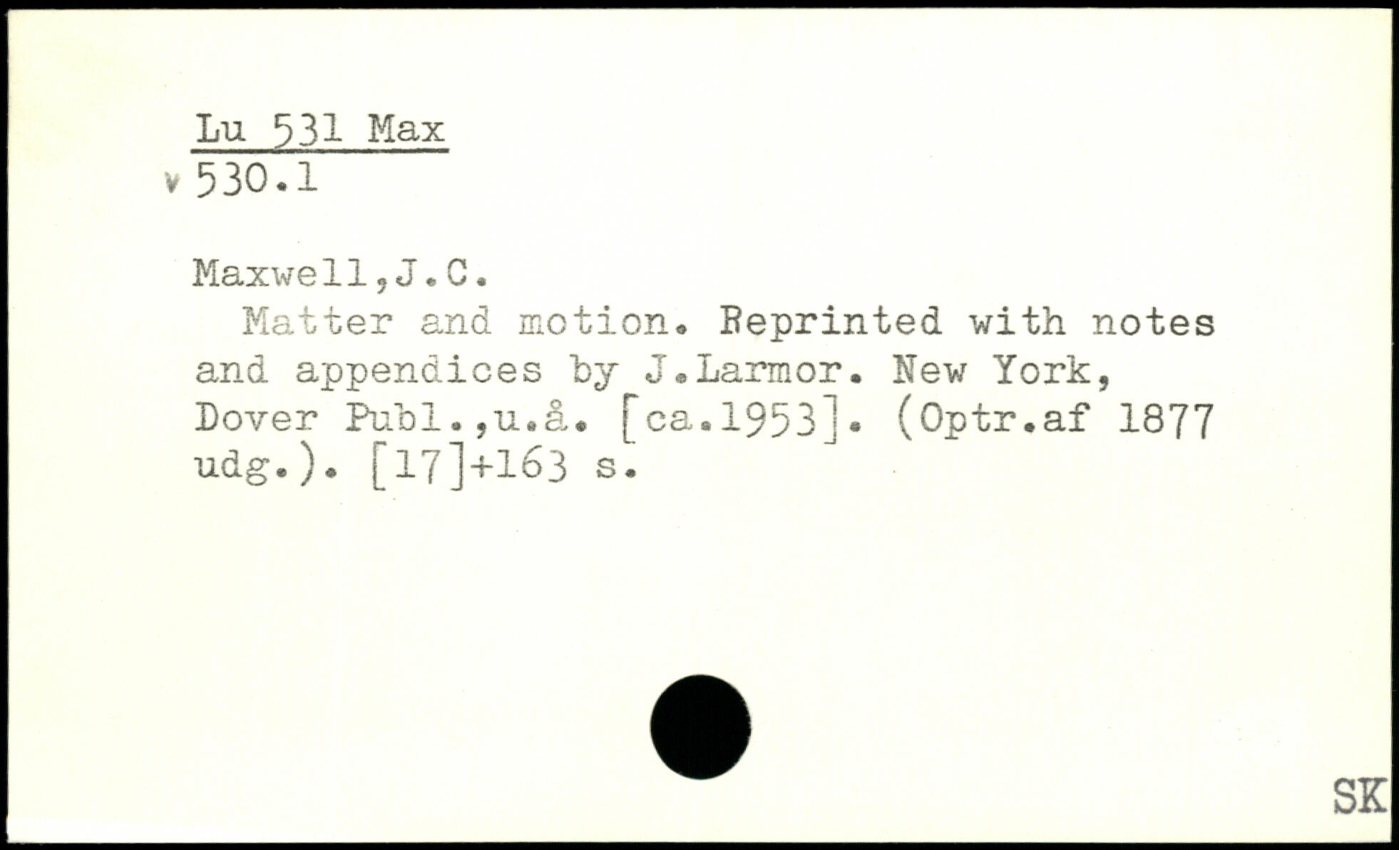 Matter and motion. Reprinted with notes and appendices by J.Larmor. New York, Dover Pubi.,u.à. [ca.1953!, (Optr.af