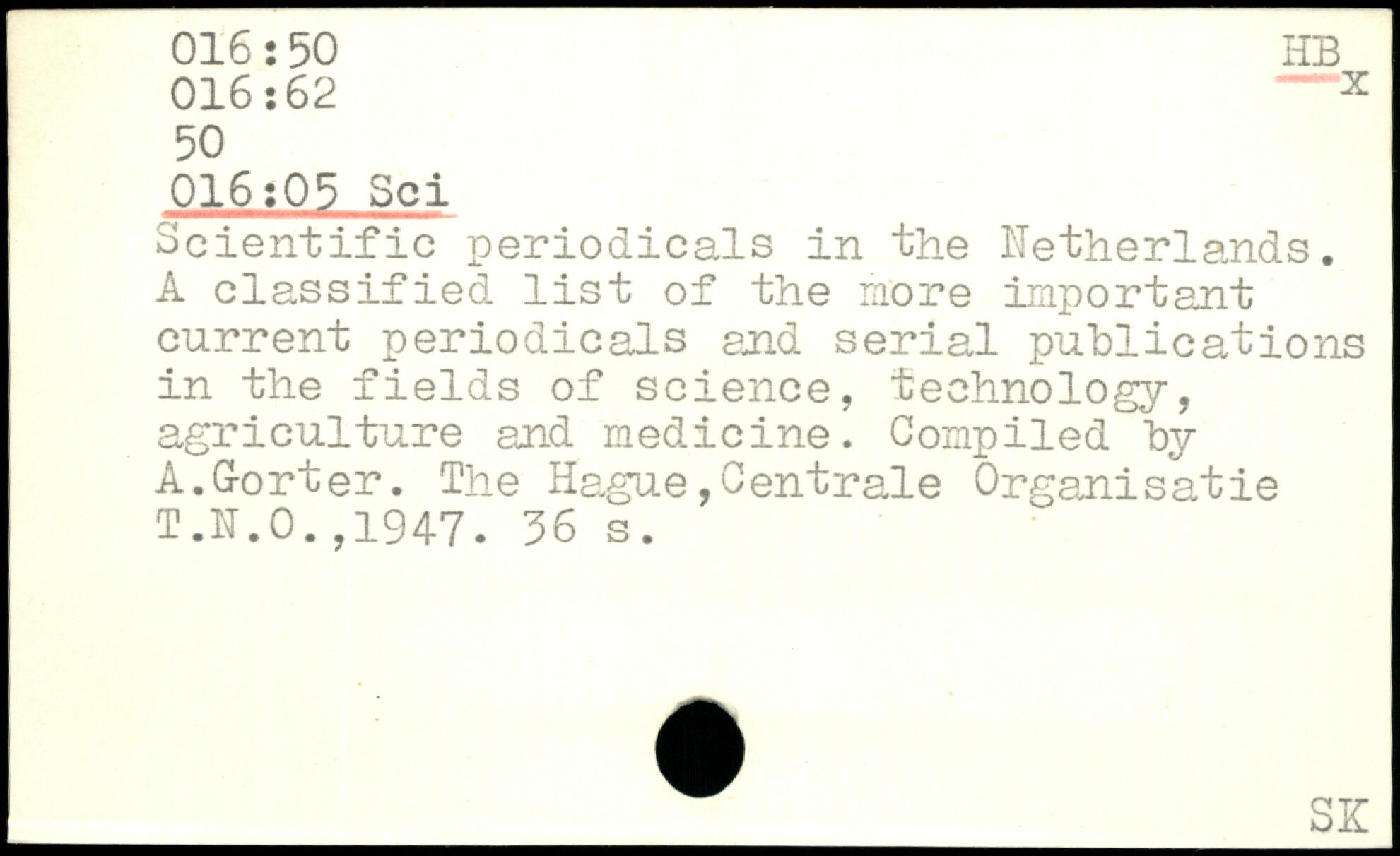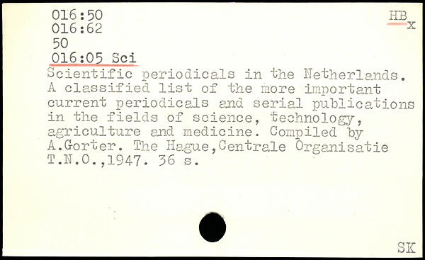 Scientific periodicals in the Netherlands. A classified list of the more important current periodicals and serial publications in the fields of science, technology, agriculture and medicine. Compiled by A.G-orter. The Hague,Centrale Organisâtie T.N.O.,1947.