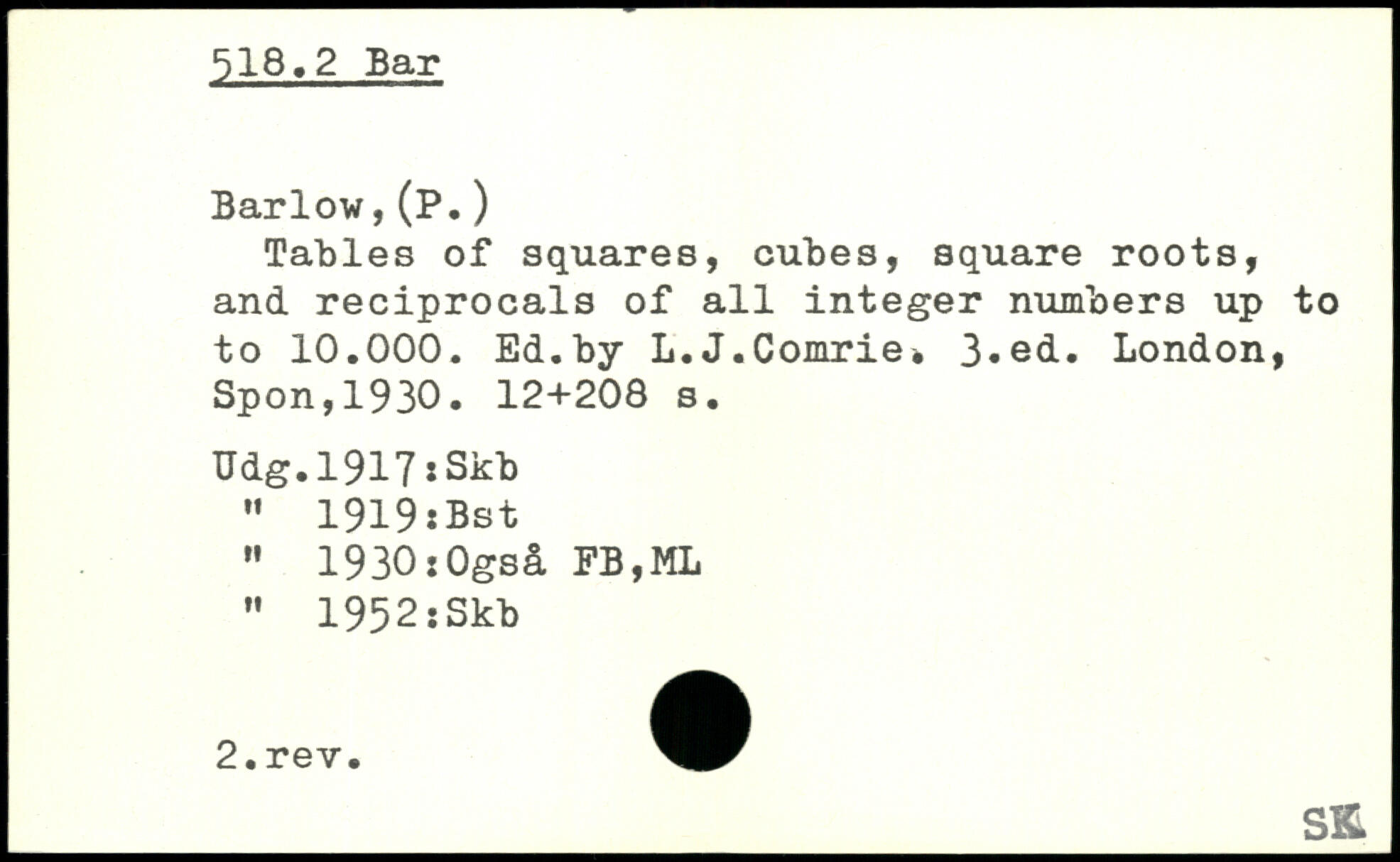 Tables of squares, cubes, square roots, and reciprocals of all integer numbers up to to 10.000. Ed.by L.J.Comrie.