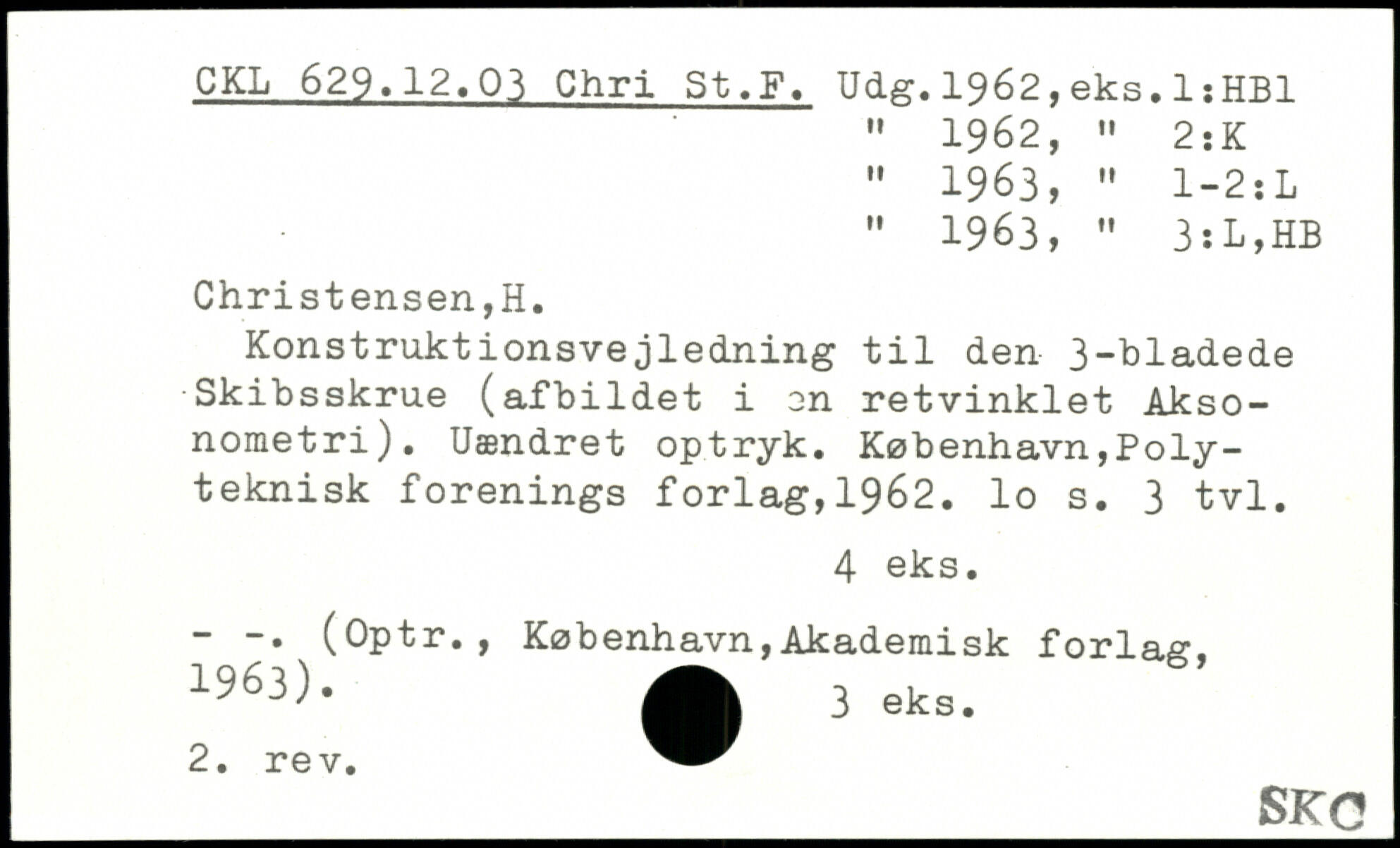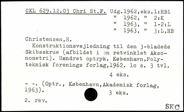 " 1962, ,' 2: K " 1963, " 1-2:L " 1963, " 3:L,HB Christensen,H. Konstruktionsvejledning til den 3-bladede Skibsskrue (afbildet i en retvinklet Akso-noraetri). Uændret optryk.