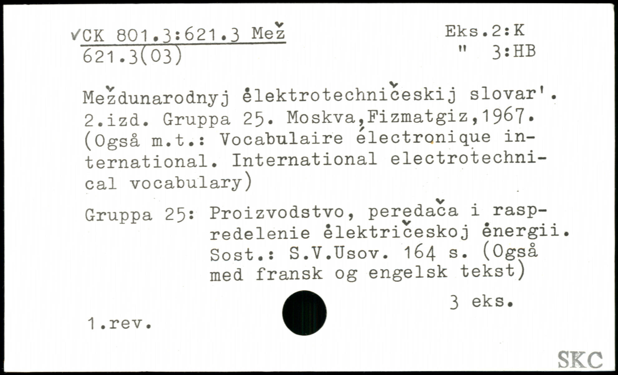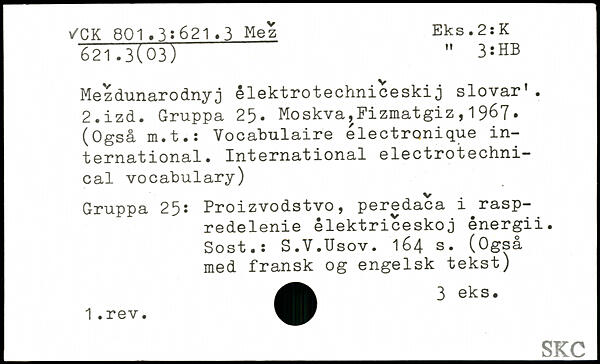 Mez dunaro dny j êlektrotechniceskij slovar1. 2.izd. Gruppa 25. MoskvajFizmatgiz,1967. (Også m.t.: Vocabulaire électronique international. International electrotechnical vocabulary) Gruppa 25: Proizvodstvo, peredaca i rasp- redelenie êlektriceskoj ênergii. Sost.î S.V.Usov.