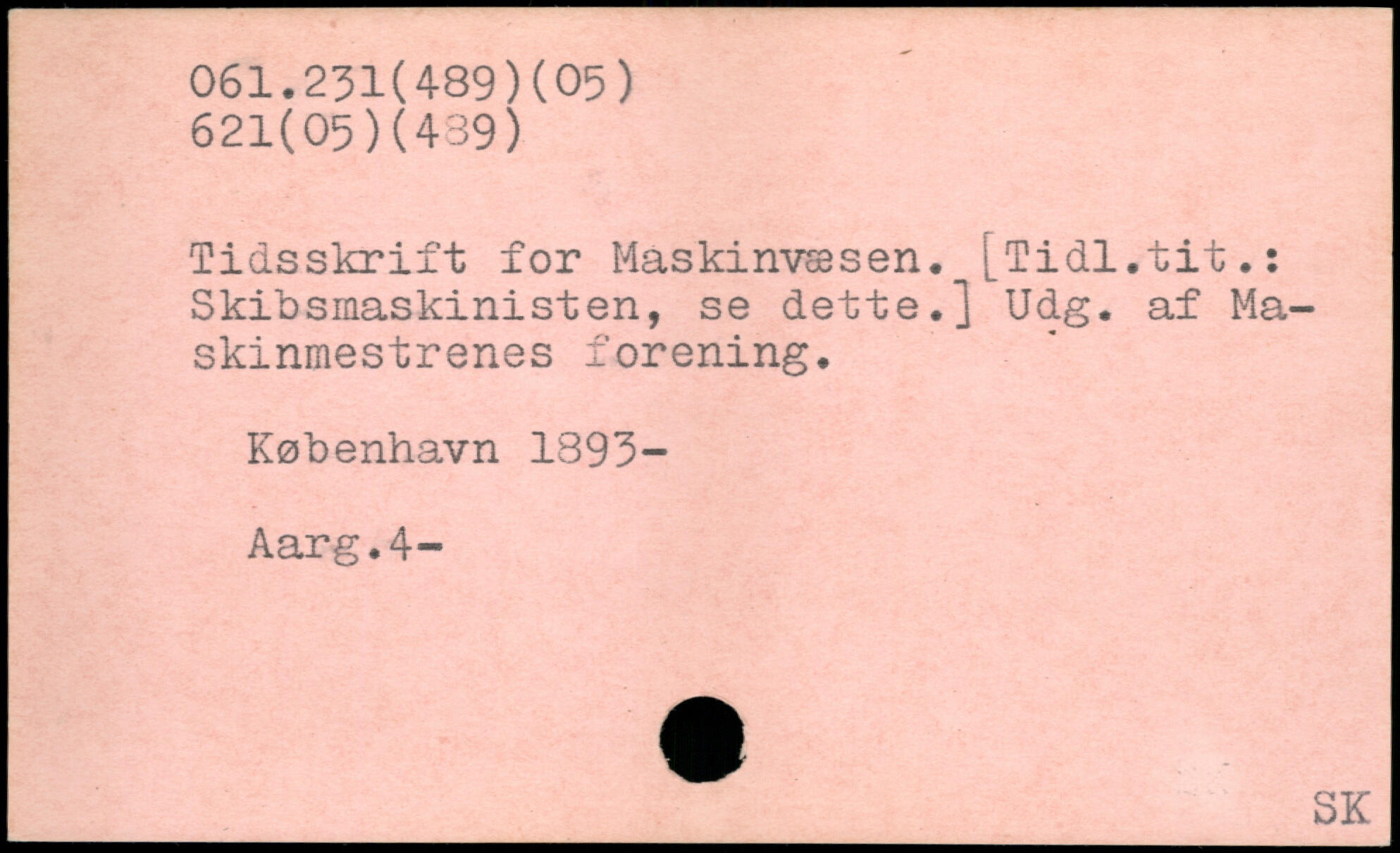 Tidsskrift for Maskinvæsen. [Tidl.tit.: Skibsmaskinisten, se dette.] Udg. af Maskinmestrenes forening.