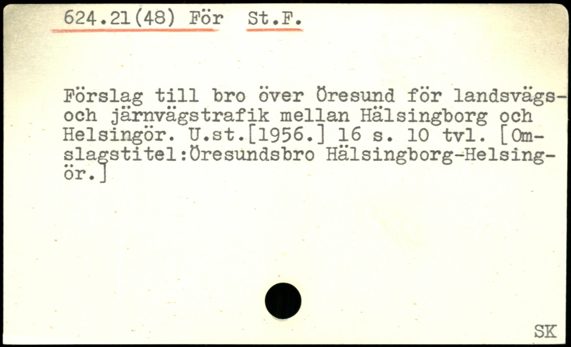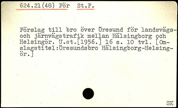 | St,F. Förslag till bro över Öresund för landsvägs-och järnvägstrafik mellan Hälsingborg och Helsingör. U.st.[1956.]