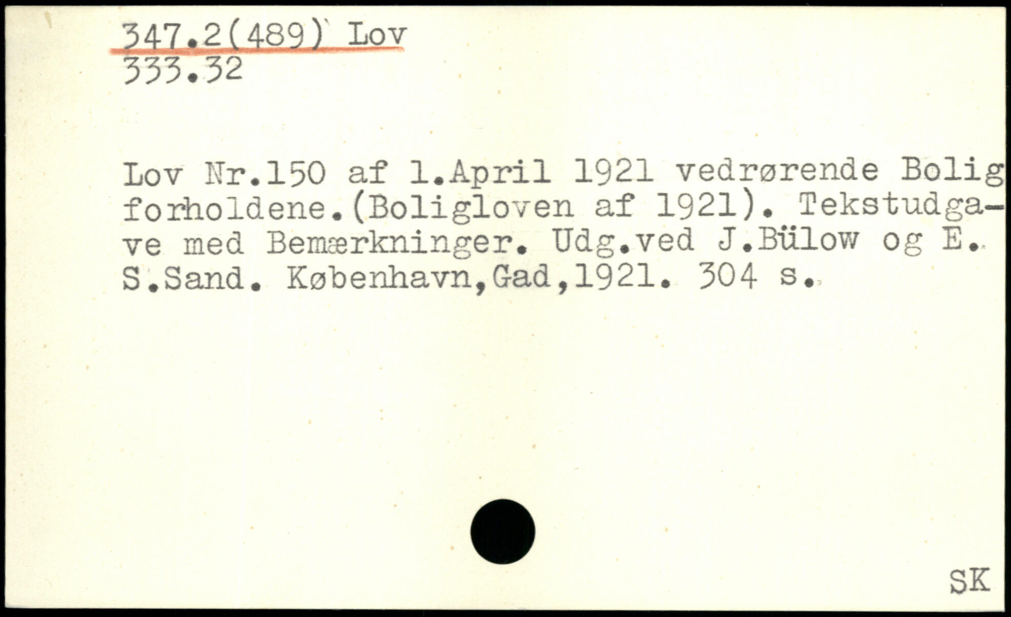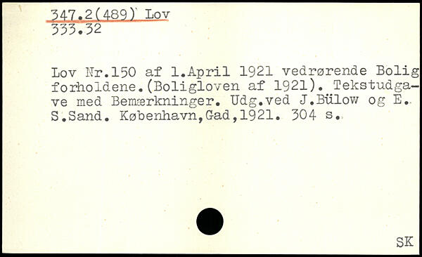 Lov Hr.150 af 1.April 1921 vedrørende Bolig forholdene.(Boligloven af 1921).^Tekstudgave med Bemærkninger. Udg.ved J.Bulow og E., S.Sand.