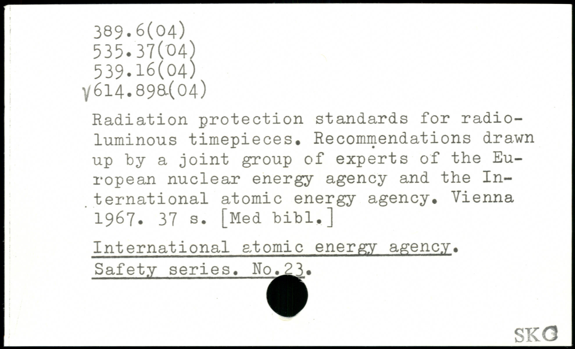 Radiation protection standards for radio-luminous timepieces. Recommendations drawn up by a joint group of experts of the European nuclear energy agency and the In-. ternational atomic energy agency. Vienna ' 1967.