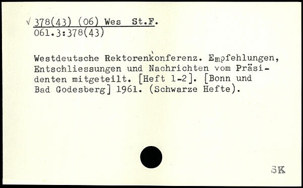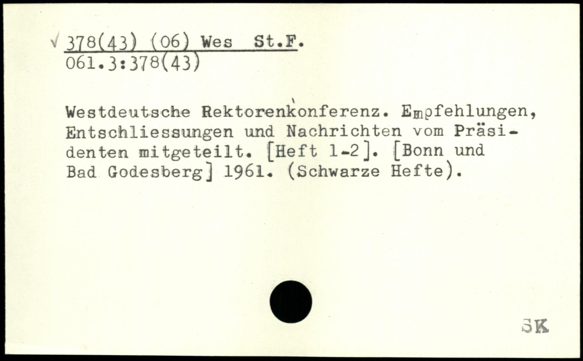 Westdeutsche Rektorenkonferenz. Empfehlungen, Entschliessungen und Nachrichten vom Präsidenten mitgeteilt. [Heft 1-2]. [Bonn und Bad Godesberg] 1961. (Schwarze Hefte).