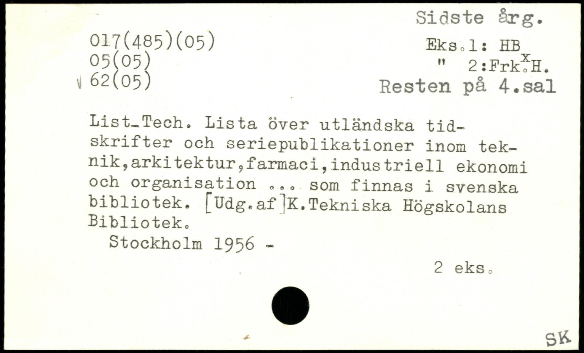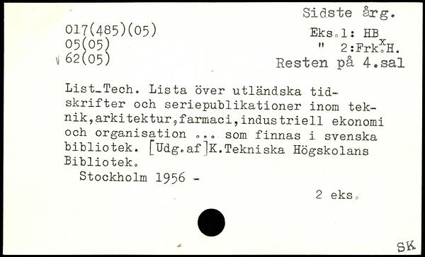 List-Tech. Lista över utländska tidskrifter och seriepublikationer inom tek-nik,arkitektur?farmaci,industriell ekonomi och organisation , ,., som finnas i svenska bibliotek. [Udg.af]K.Tekniska Högskolans Bibliotek.