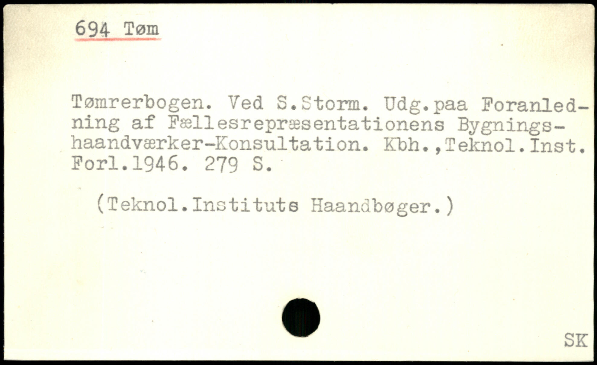 Tømrerbogen. Ved S.Storm. Udg.paa Foranledning af Fællesrepræsentationens Bygnings-haandværker-Konsultation. Kbh.,Teknol.Inst. Forl.1946.