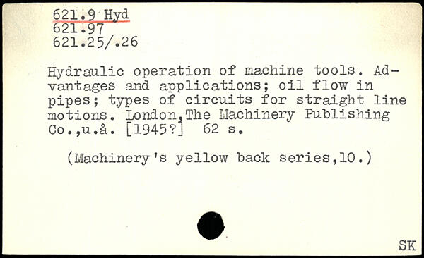 Hydraulic operation of machine tools. Advantages and applications; oil flow in pipes; types of circuits for straight line motions. London.The Machinery Publishing Co.,u.§i. [1945?]