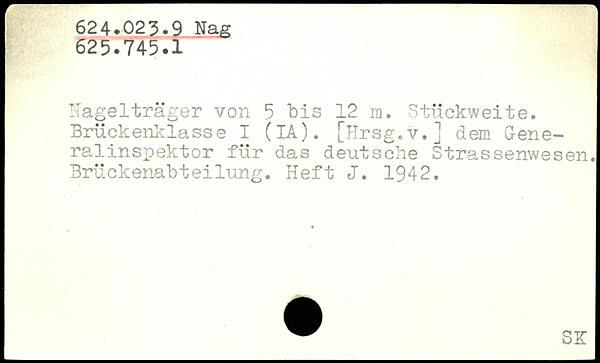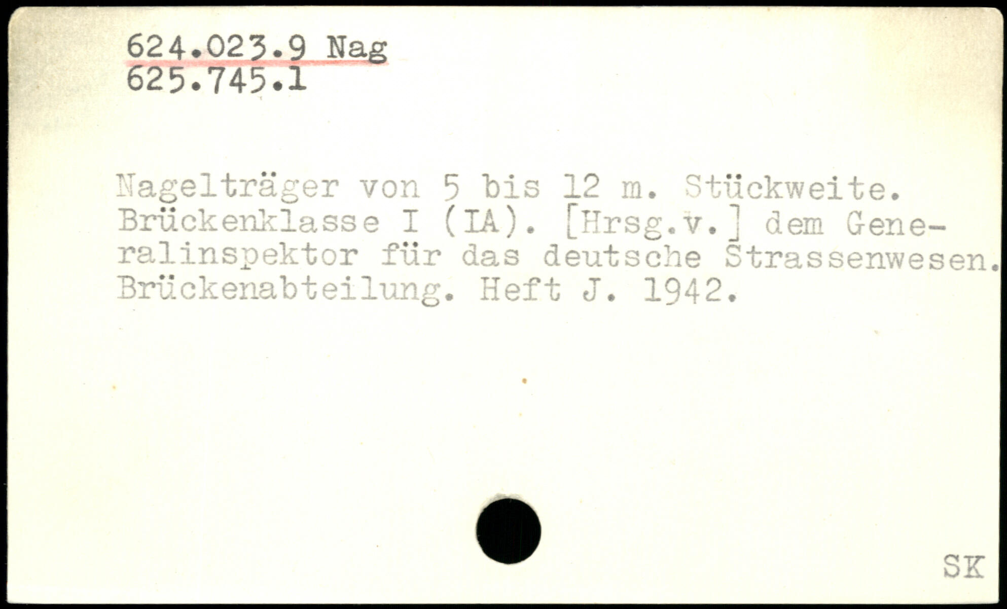 Nagelträger von 5 bis 12 m. Stückweite. Brück enkla ss e I (IA). [Hrsg.v.] dem Generalinspektor für das deutsche Strassenwesen. Brückenabteilung. Heft J. 1942.