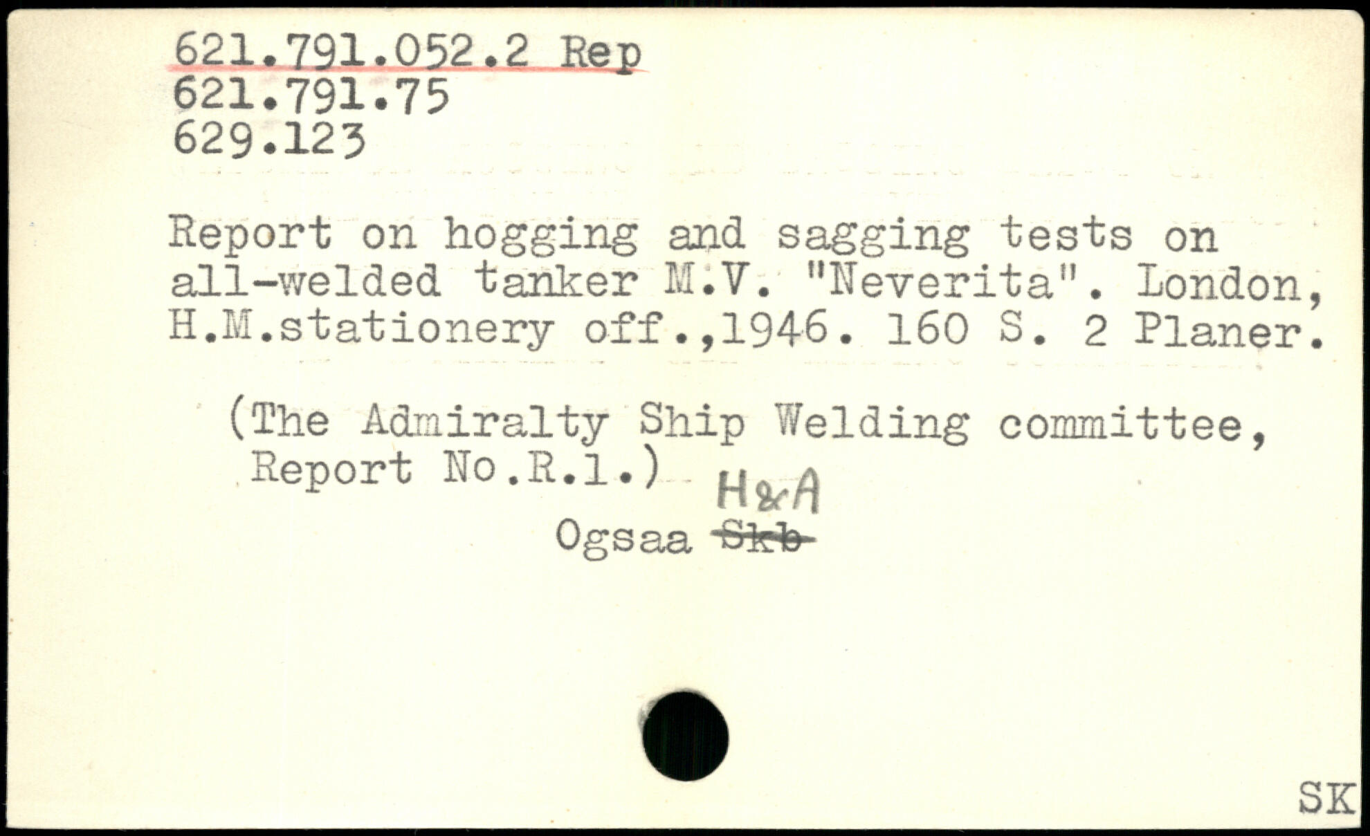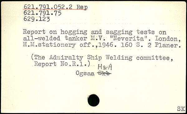 Report on hogging and sagging tests on all-welded tanker M.V. "Neverita". London, H.M.stationery off.,1946.