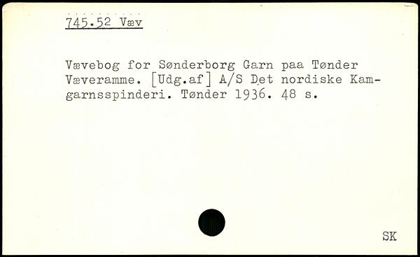 Vævebog for Sønderborg Garn paa Tønder Væveramme. [Udg.af] A/S Det nordiske Kam-garnsspinderi. Tønder 1936.