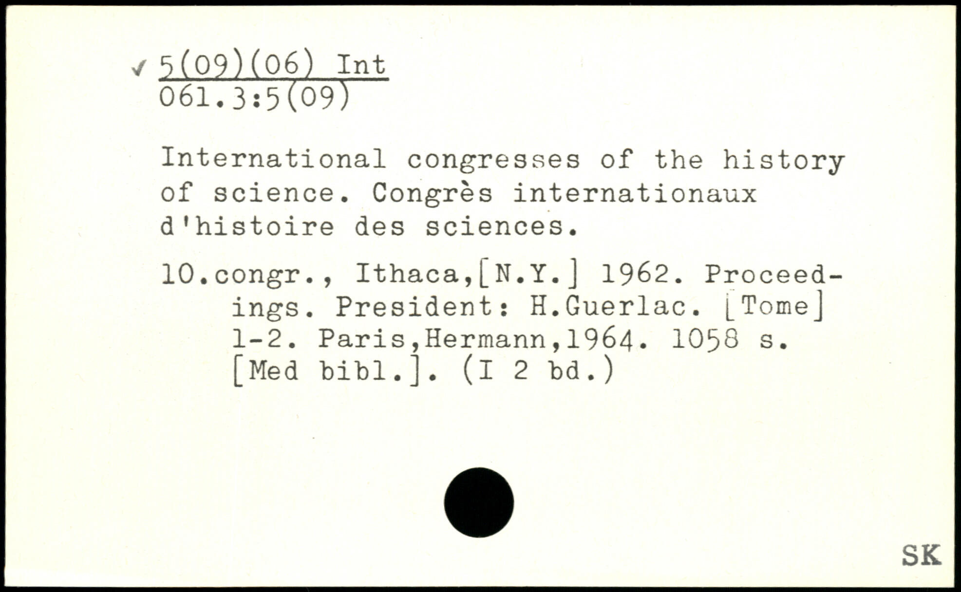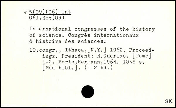 International congresses of the history of science. Congrès internationaux d'histoire des sciences. lO.congr., Ithaca,[N.Y.J 1962. Proceedings. President: H.Guerlac. [Tome] 1-2.