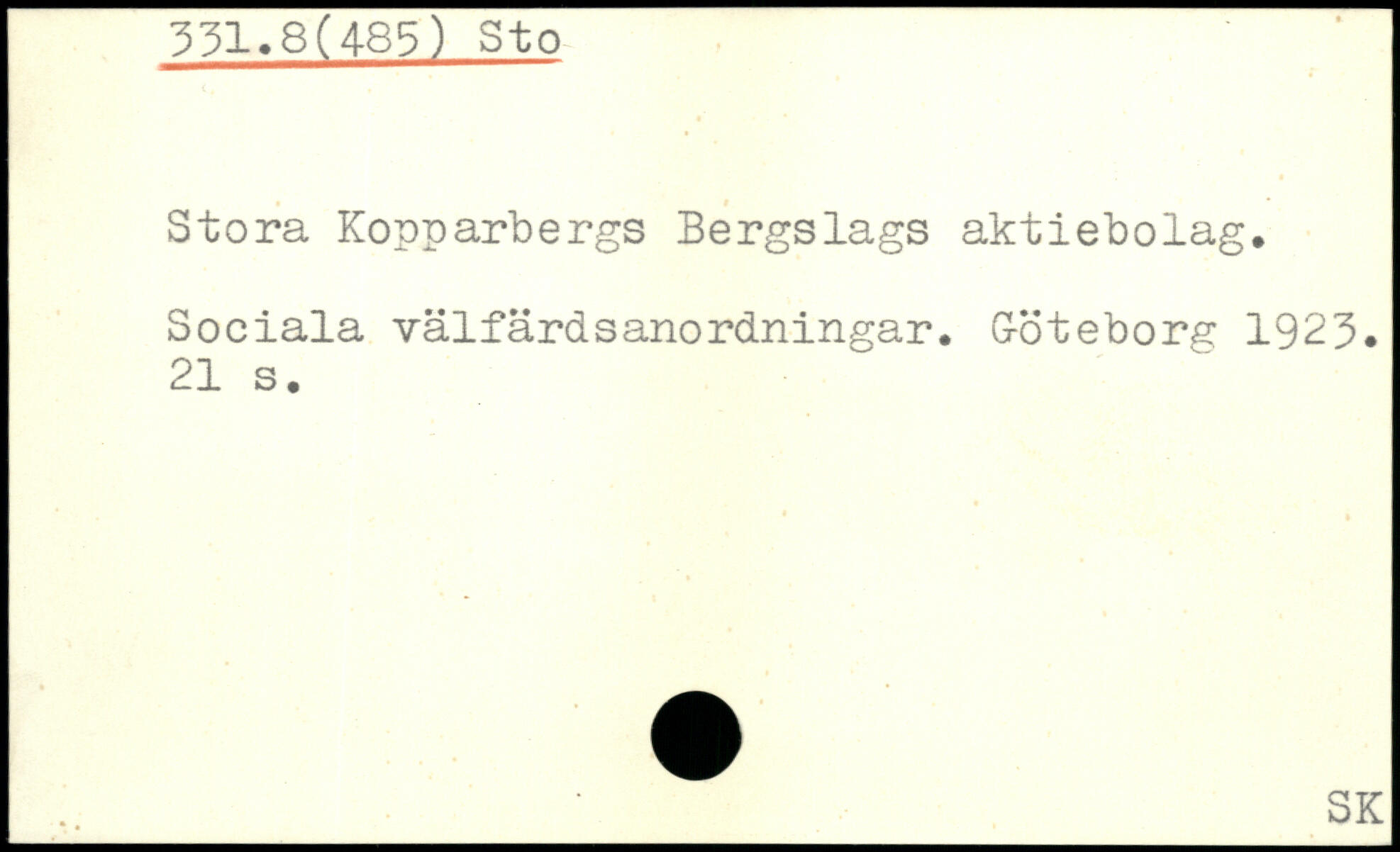 Stora Kopparbergs Bergslags aktiebolag. Sociala välfärdsanordningar. G-öteborg 1923.