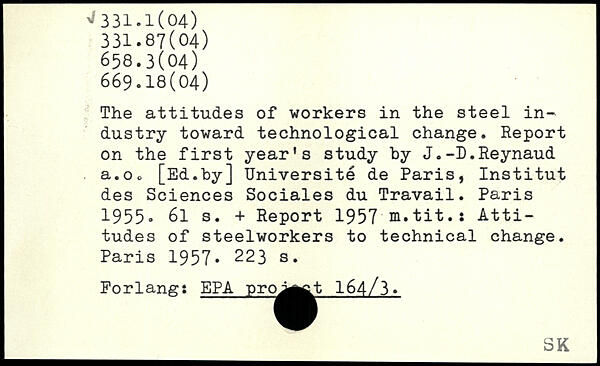 The attitudes of workers in the steel industry toward technological change. Report on the first year's study by J.-D.Reynaud a.o. [Ed.by] Université de Paris, Institut des Sciences Sociales du Travail.