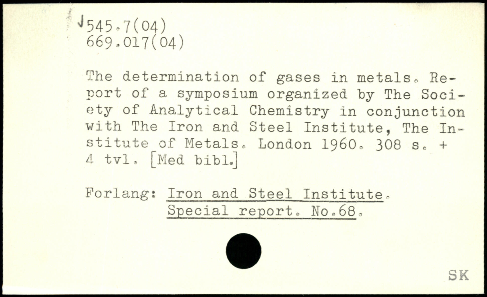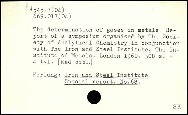 The determination of gases in metals-, Report of a symposium organized by The Society of Analytical Chemistry in conjunction with The Iron and Steel Institute, The Institute of Metals